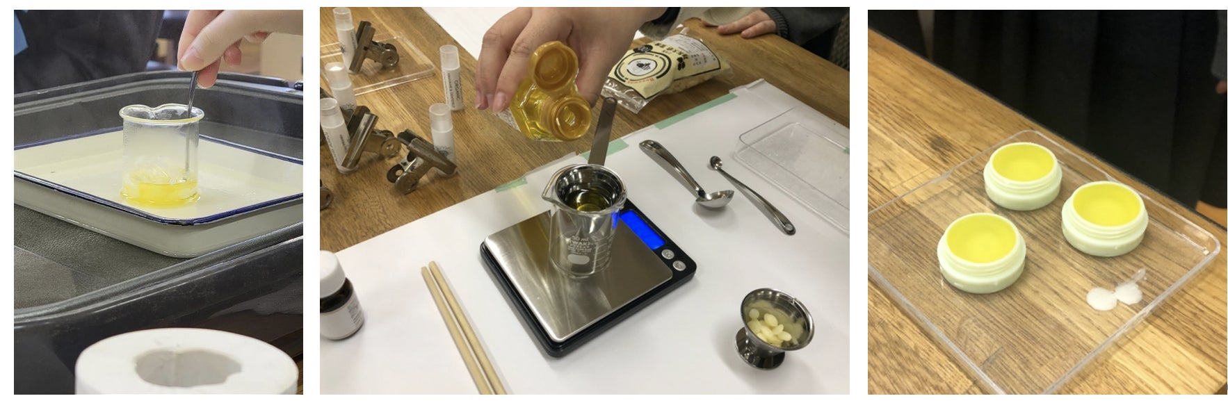 今回つくるのは、「リップバーム」です。リップバームとはスティックではなく、ジャー容器というふた付きの容器に入ったリップクリームです。持ち運びに便利なスティックタイプに比べて、保湿力の高いものになります。ですから、家に帰ってゆっくり唇にうるおいをあたえるのに使って欲しい商品です。材料も取手市内で無農薬で育てたひまわりのほか、天然素材の原料にこだわったものを目指しています。