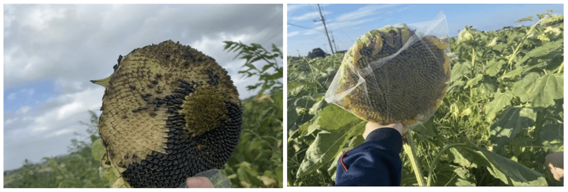 昨年頃から急にカワラヒワという鳥の被害が甚大になっています。今まではなかったそうで、環境の変化が影響をしているのかもしれないとのことです。ひまわりひとつひとつに鳥に食べられないように網をかぶせます。