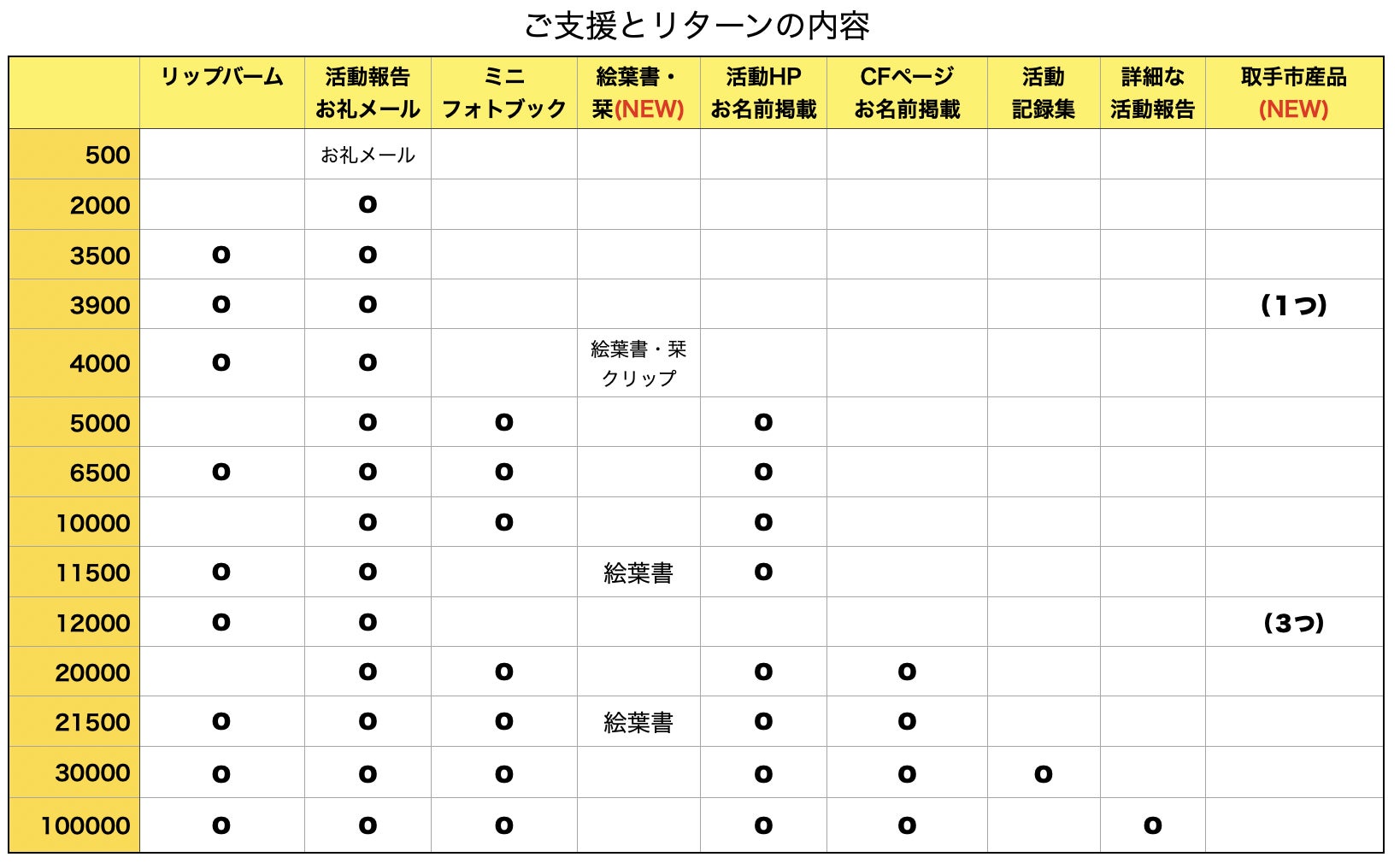 ご意見をいただきましたので、遅いとは思いますがリターンの種類を追加しました(4月24日)