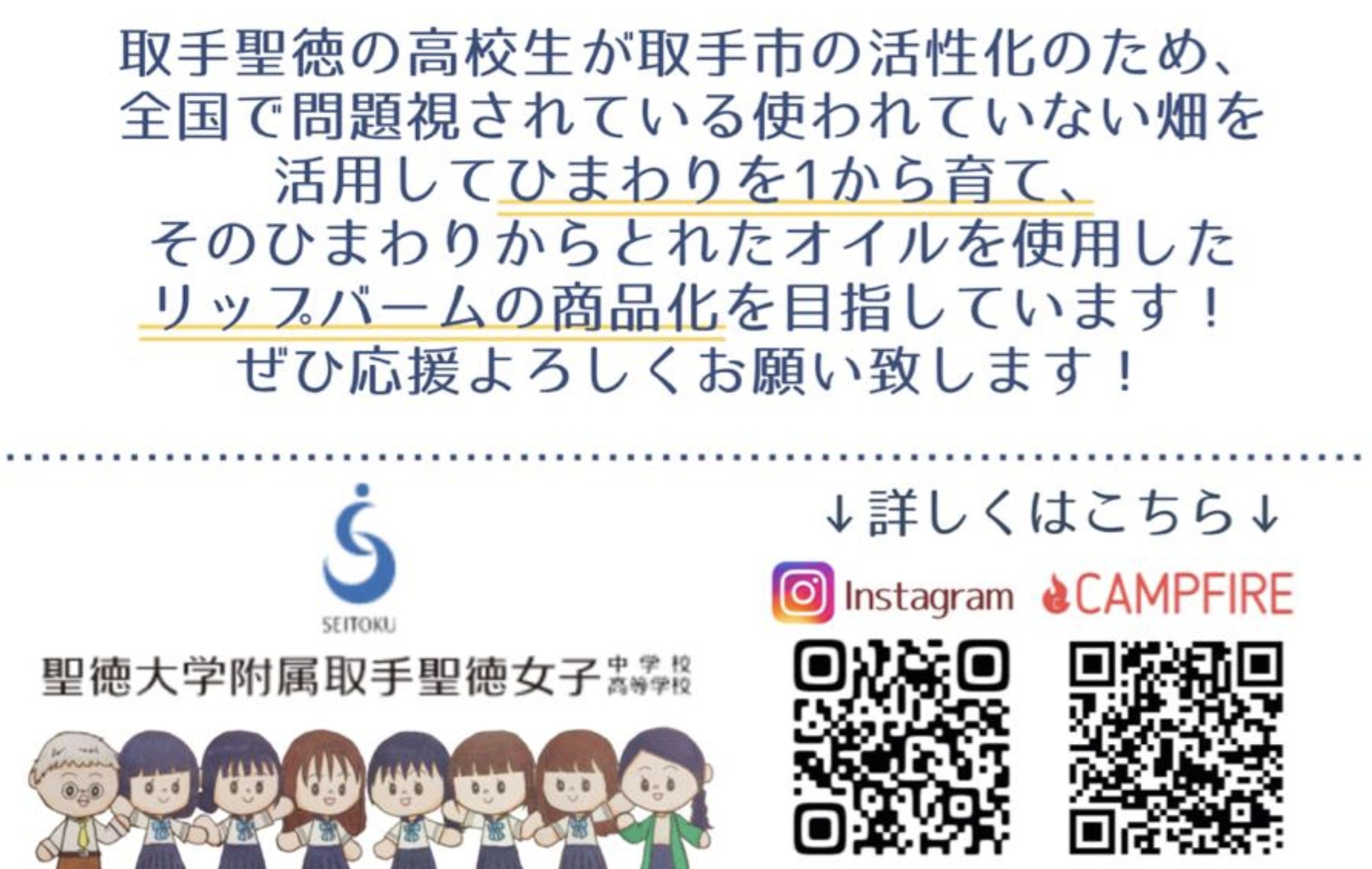 「ひまわりプロジェクト」はSDGsの取り組みの一つとして環境改善、地域連携を目標に、茨城県内の遊休農地解消と地産地消のを目指し、ひまわりの種から搾油したオイルを使用したリップバームを作り、商品化に挑戦します。そして、最終的には取手市のふるさと納税の返礼品として登録してもらうことで、全国の方から注文を頂ける体制を整えて、地域の経済循環を活性化することを目指しています!