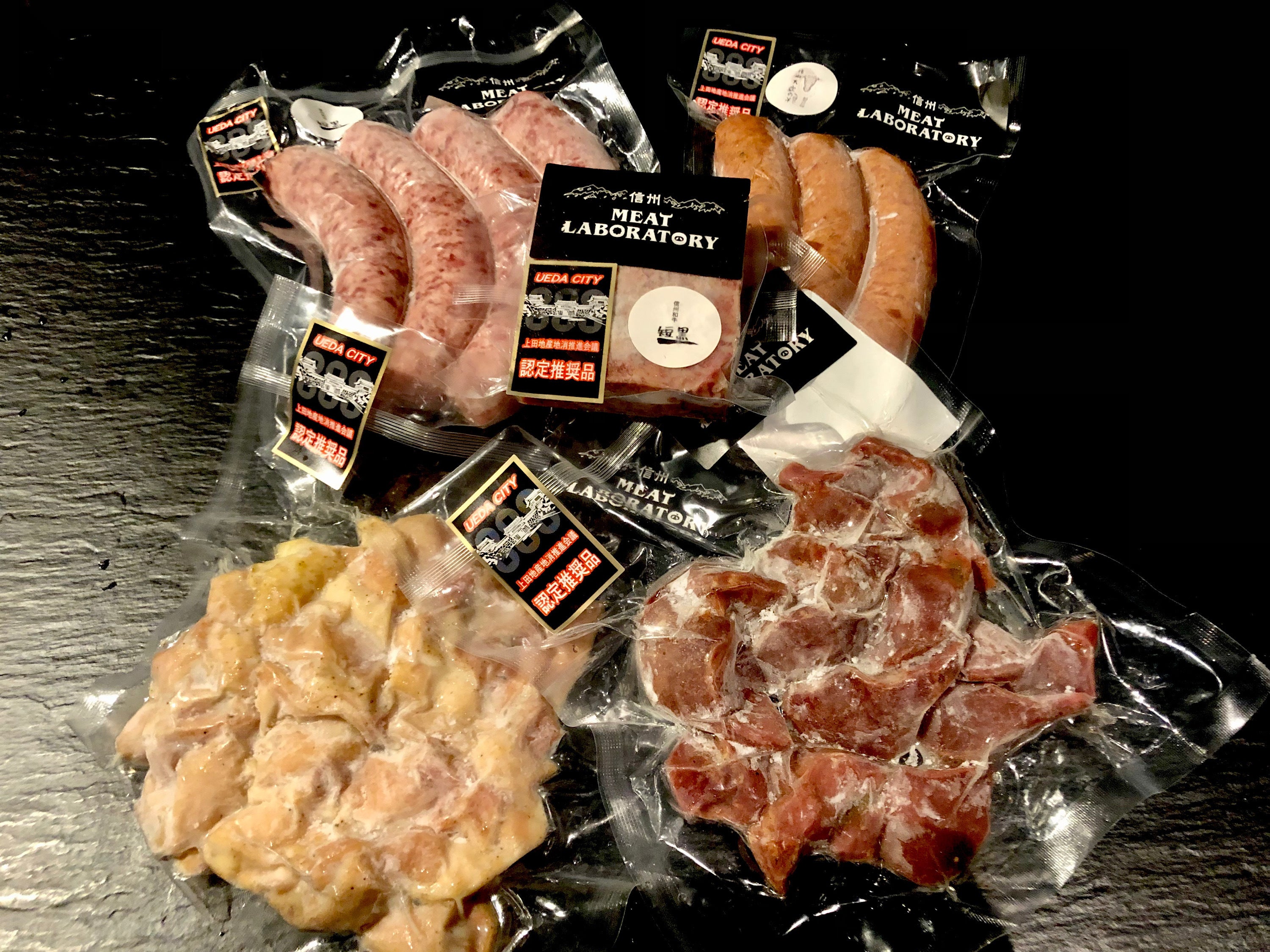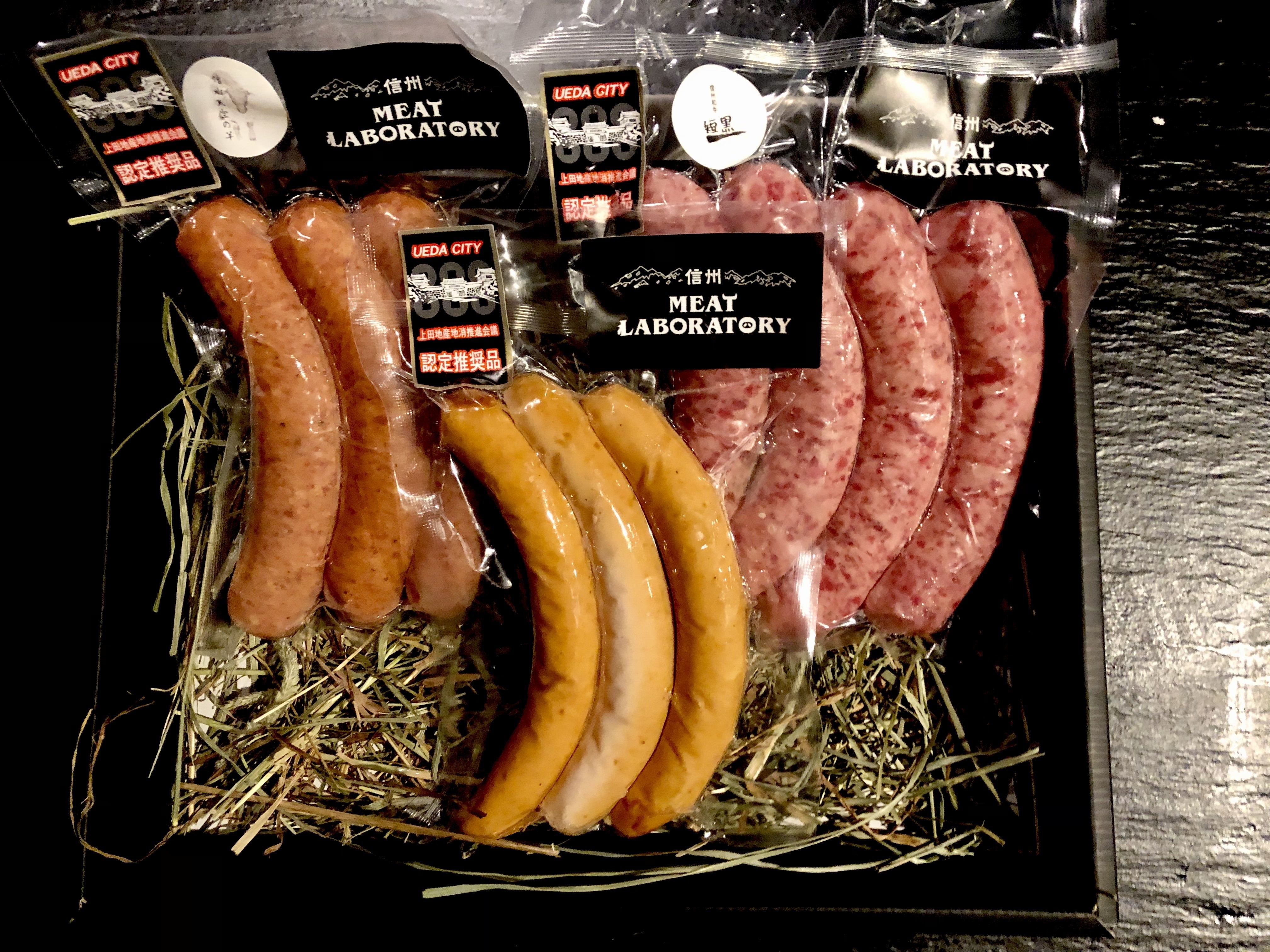 信州産ダボス牧場原産タン黒和牛100%使用のソーセージ、信州産ダボス牧場原産黒毛和羊サフォーク種100%使用のソーセージ、信州産オオサワ農園真田丸100%使用のソーセージのそれぞれ1パックずつ詰めてご提供
