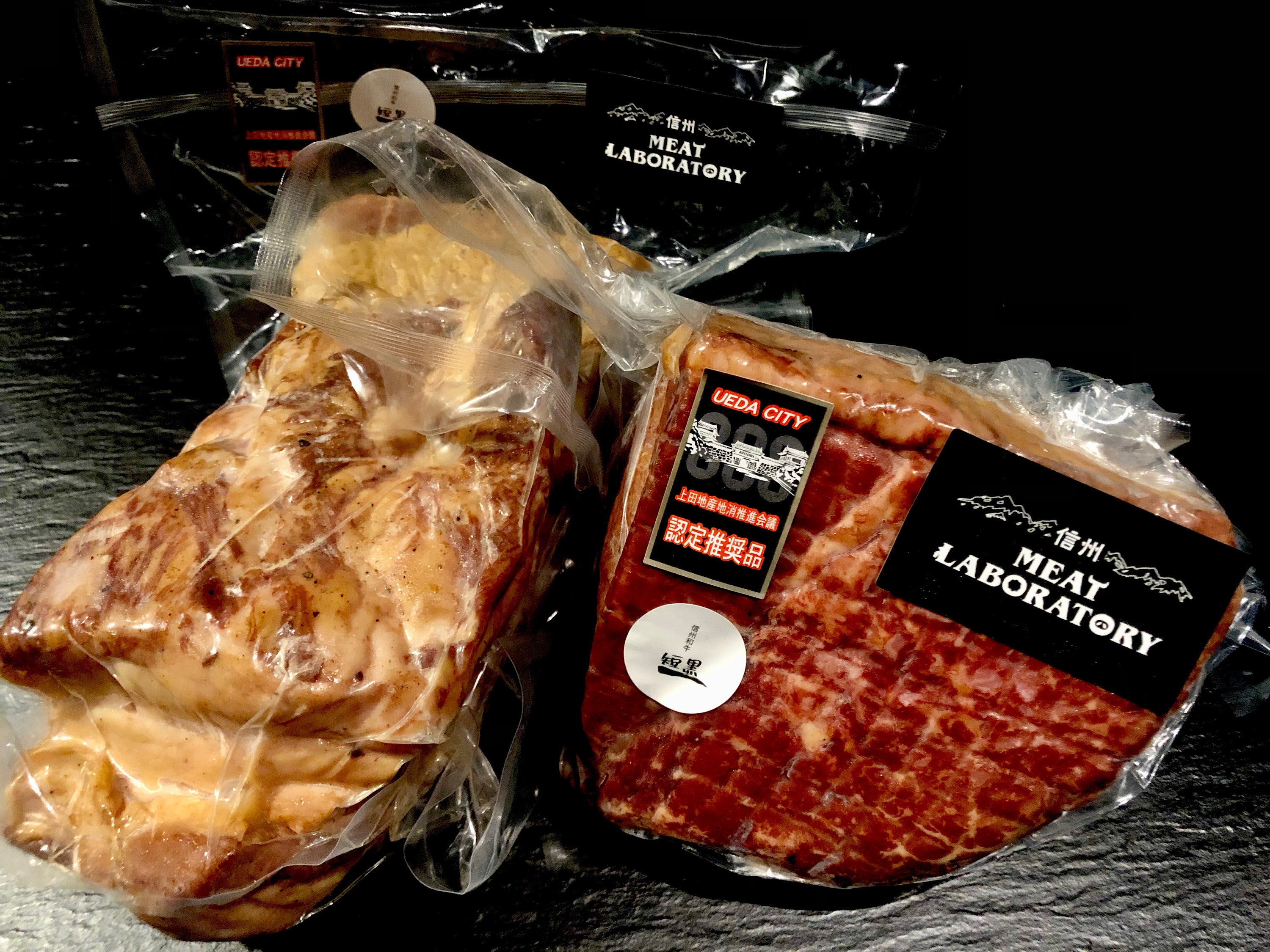 信州菅平のダボス牧場で健康に安全に育てられた信州菅平原産の短黒和牛を贅沢にハムとベーコンに仕立て上げました。ハム、ベーコンのステーキにもご活用。ご自身の好きな大きさに切り分けてガッツリと召し上がれる商品となっております。数量限定で2個までです。