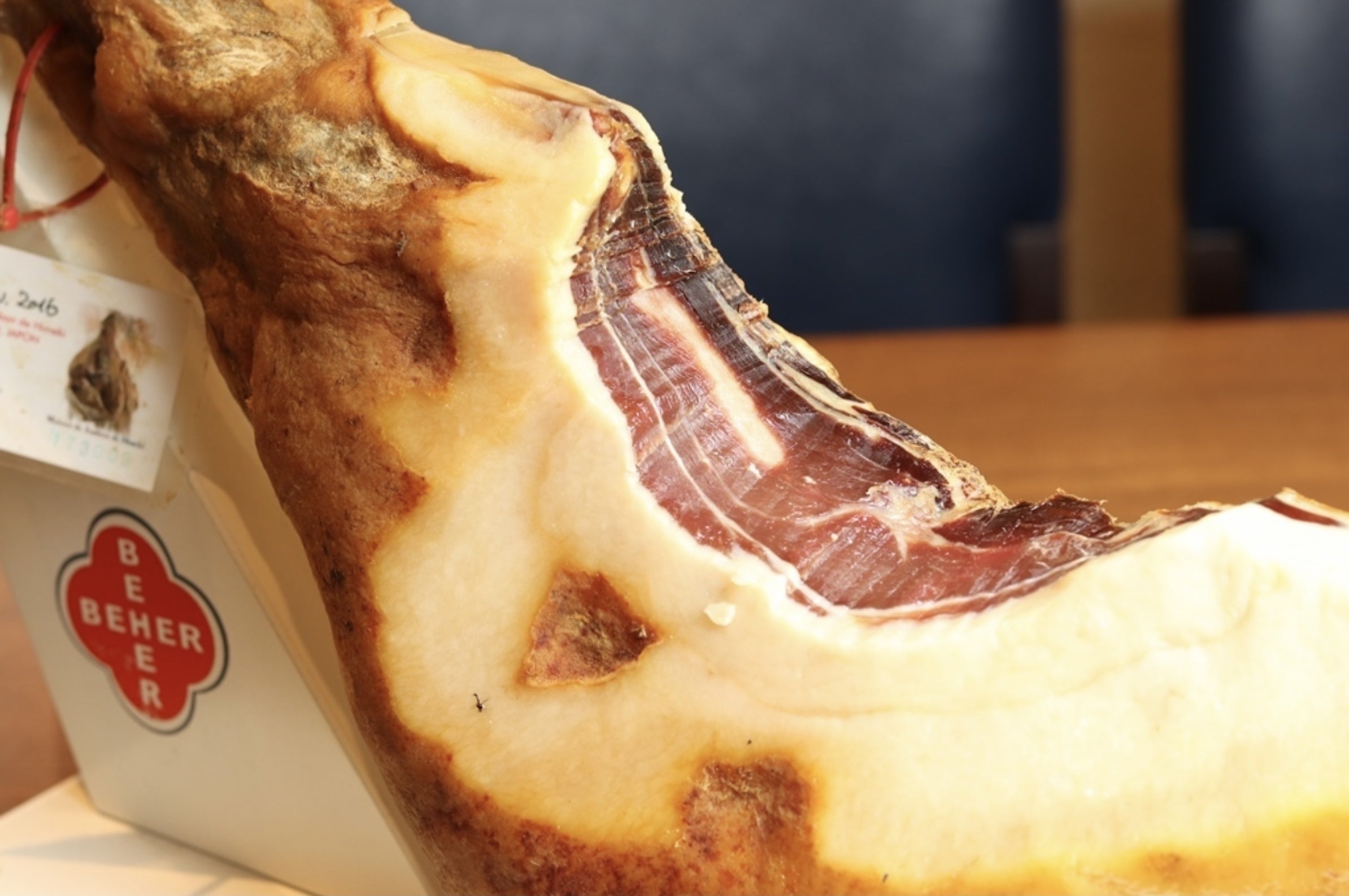 信州菅平のダボス牧場で丁寧に育てられ、ストレスもなく豚肉本来の旨味を味わうことができる希少な豚肉です。肉と脂の割合もよく、臭みも少ない希少な中ヨークシャーの生ハムを贅沢に原木にしてご提供いたします。