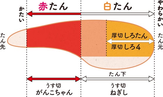 牛の舌の付け根の部分「たん元」がこの「白たん」と呼ばれます。あまり動かさない部位のためとても柔らかく脂がのる部位です。
