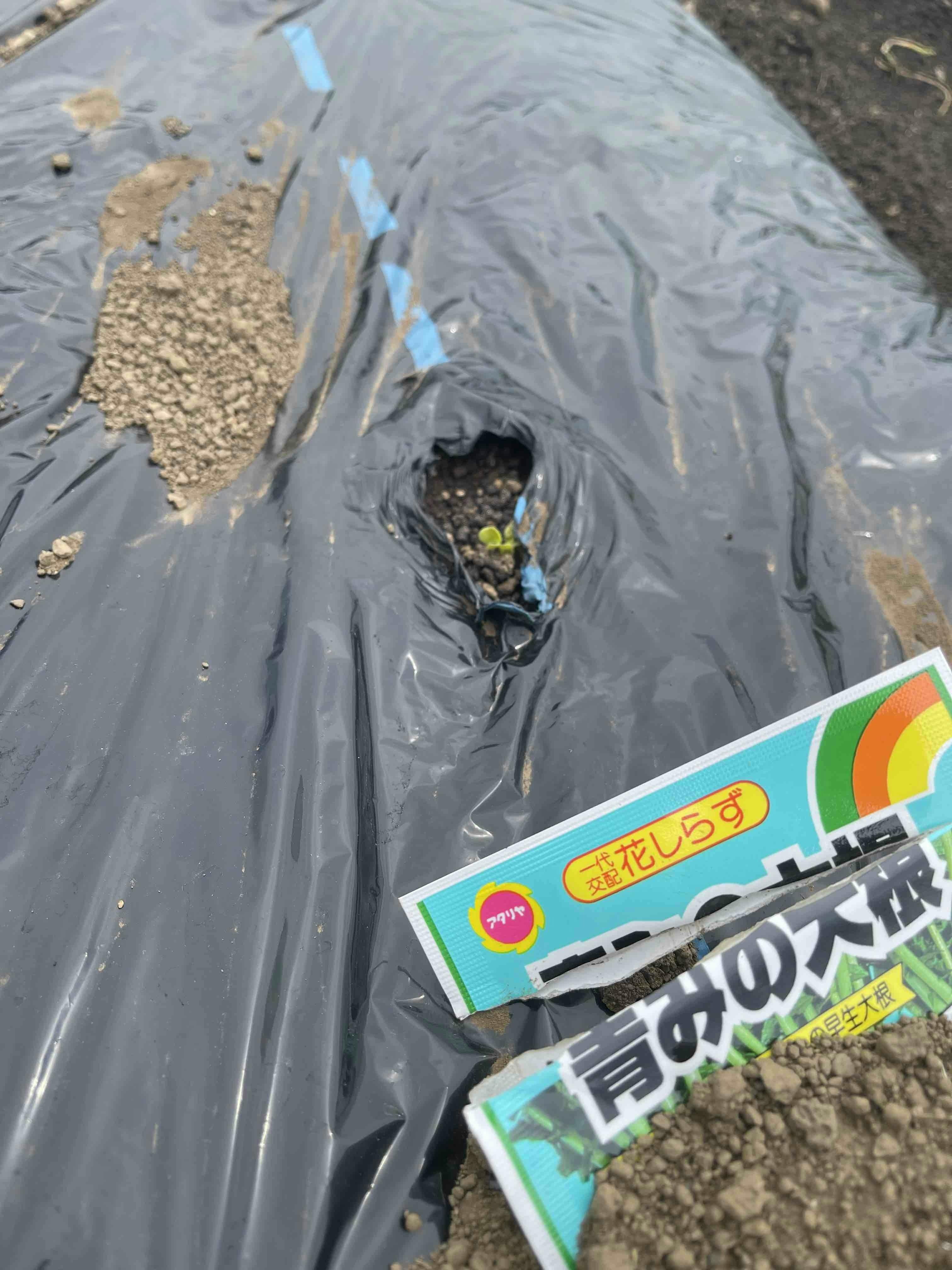 先日しいたマルチに大根の種を植え付けておいたのですが、なんと!目が出てきました!