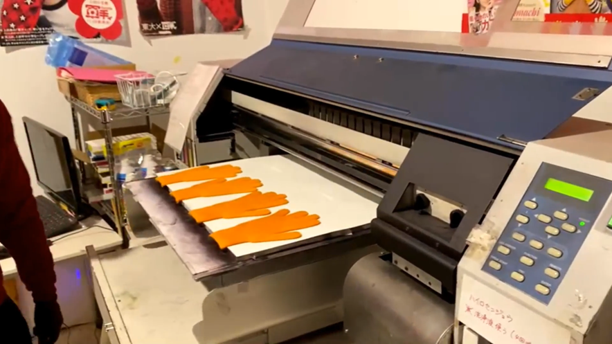 私たちは、自分たちでデザインを考え、自分たちの手でそのデザインを印刷しています。1時間で印刷できるのはおよそ20双。1双1双丁寧に印刷し、梱包した軍手ィを販売しています。