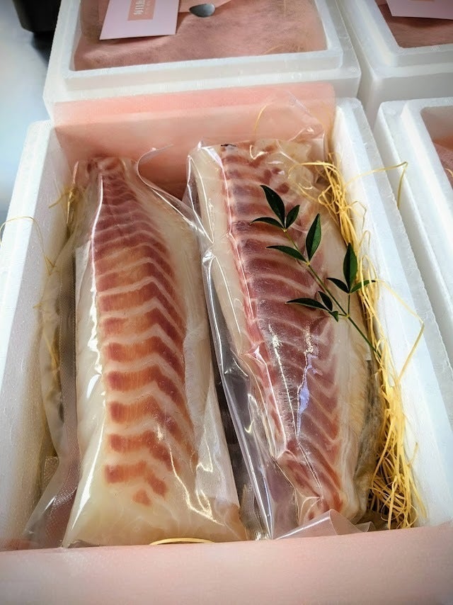 販売する魚はすべて柵(さく)の状態で真空パックしております。理由は切りたてのお刺身の美味しさを家庭で体感してもらうためです。お刺身は切りたてが一番美味しいと私は思っています。なんなら”まな板で切った瞬間、ひと口食べてもらいたい”くらいです。