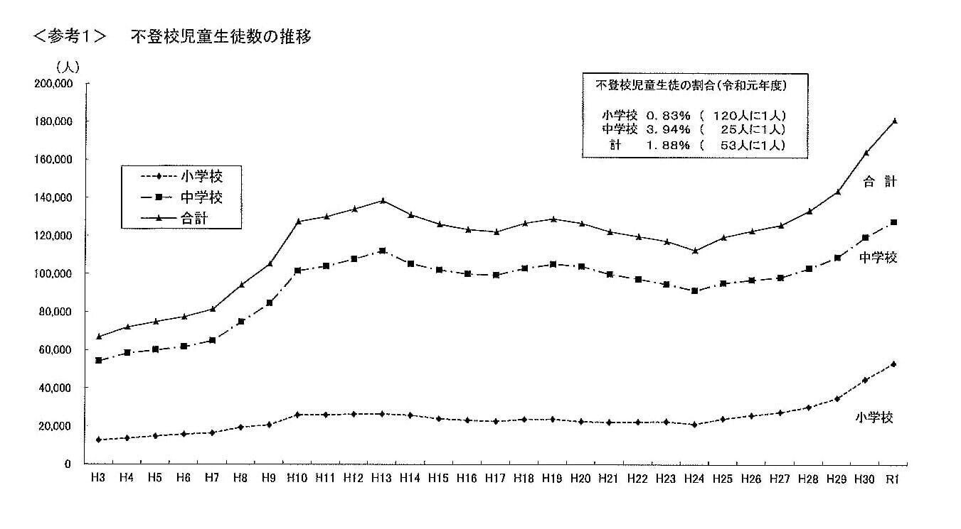 2019年度の文科省の調査によると、何らかの理由で学校へ行けない児童生徒の数が16万人を超えました。2020年11月に出た調査では18万人、コロナの影響などもあり次年度以降には20万人を超えるかもしれないと言われています。私達が親の会を開催していた2015年頃は12万ほどでしたが、数年であっという間に増えてしまいました。