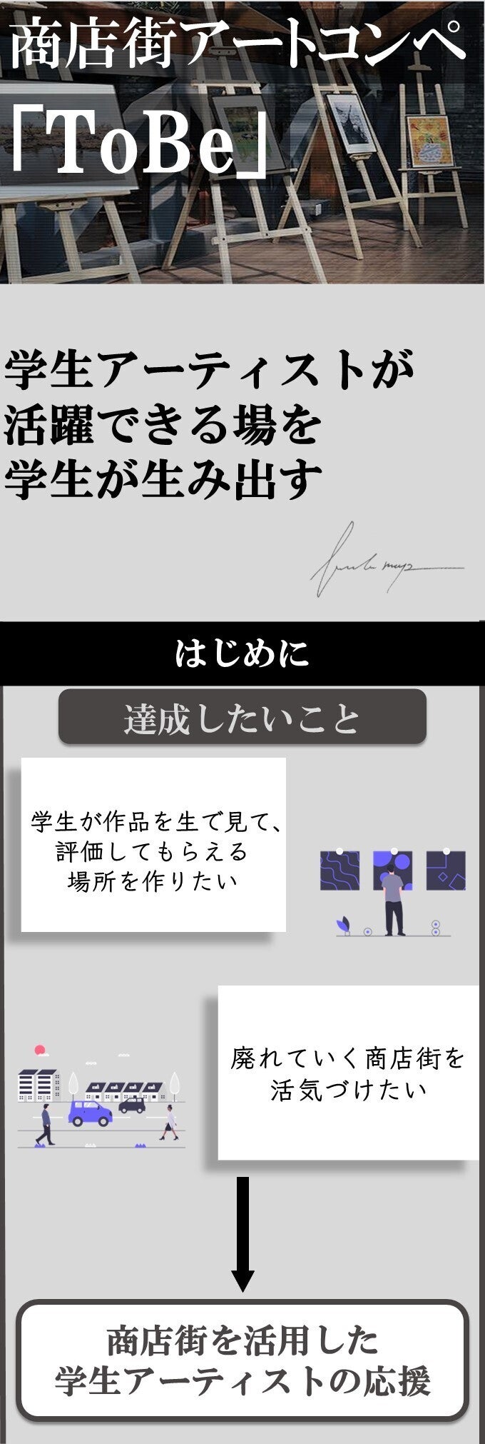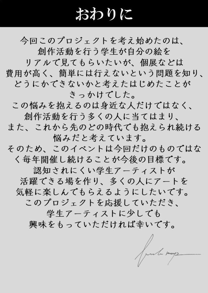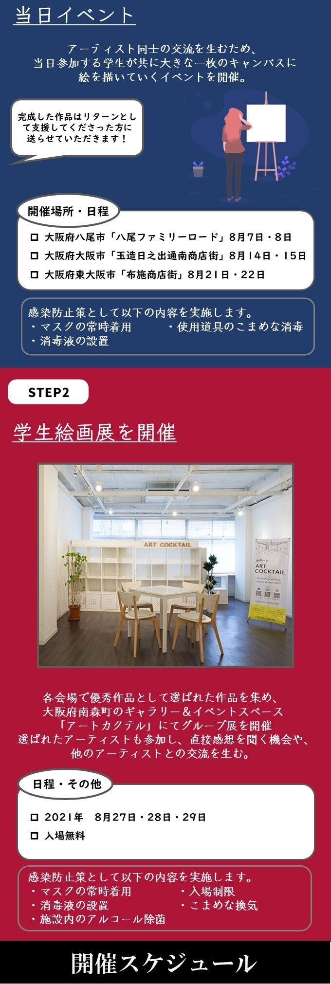 2022/02/05 12:41延期後の開催日程及びリターンのお届け予定が確定しましたので報告させていただきます!延期後の日程「商店街アートコンペ」日程:2022年 3月19日・20日場所:八尾ファミリーロード「学生絵画展」日程:2022年 4月29日〜5月1日場所:ART COCKTAIL3つの商店街を舞台にしておりましたが、新型コロナウイルス感染者数増加の現状を考慮し、規模を縮小した形での開催を決定いたしました。開催場所を一つの商店街にし、感染予防を徹底して行った上で本イベントを開催します。リターンについて開催日程確定に伴い、リターンのお届け予定も確定しました。全リターン5月中のお届け予定とさせていただきます。大変お待たせいたしました!当日のご参加お待ちしております! もっと見る【リターンお届け予定の変更について】