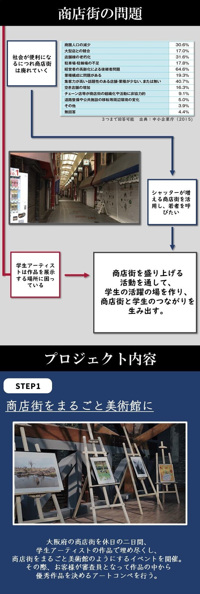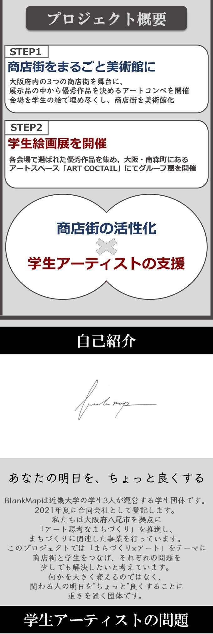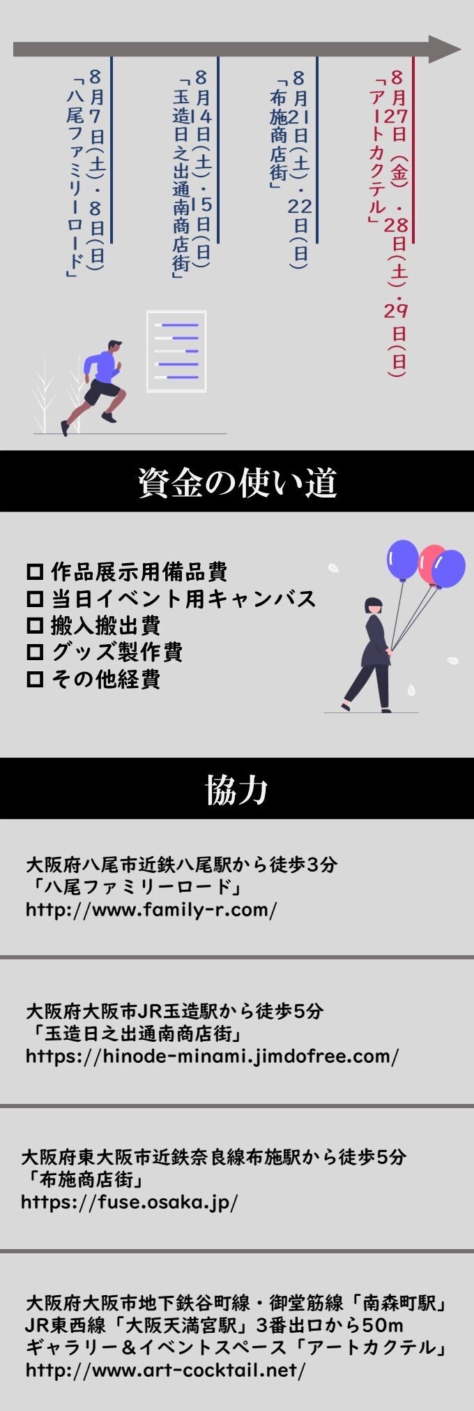 2022/02/05 12:41延期後の開催日程及びリターンのお届け予定が確定しましたので報告させていただきます!延期後の日程「商店街アートコンペ」日程:2022年 3月19日・20日場所:八尾ファミリーロード「学生絵画展」日程:2022年 4月29日〜5月1日場所:ART COCKTAIL3つの商店街を舞台にしておりましたが、新型コロナウイルス感染者数増加の現状を考慮し、規模を縮小した形での開催を決定いたしました。開催場所を一つの商店街にし、感染予防を徹底して行った上で本イベントを開催します。リターンについて開催日程確定に伴い、リターンのお届け予定も確定しました。全リターン5月中のお届け予定とさせていただきます。大変お待たせいたしました!当日のご参加お待ちしております! もっと見る【リターンお届け予定の変更について】