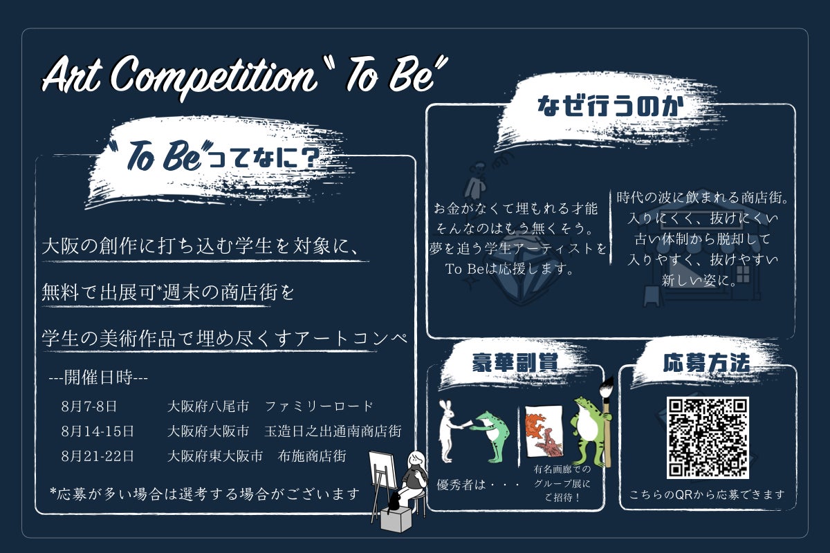 2021/07/17 12:03アートコンペ「ToBe」開催延期に伴い、リターンのお届け予定も変更になります。イベント終了の二か月後にお届けする予定です。イベントの日程が決まり次第リターンの予定に関しても活動報告にて連絡させていただきます。何とぞご理解のほどよろしくお願い申し上げます。 もっと見る【イベント開催延期について】