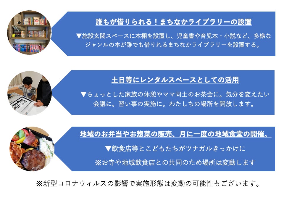 具体的には、学童・フリースクールとしてだけでなく以下のような機能をもたせた施設として活用してく予定です。