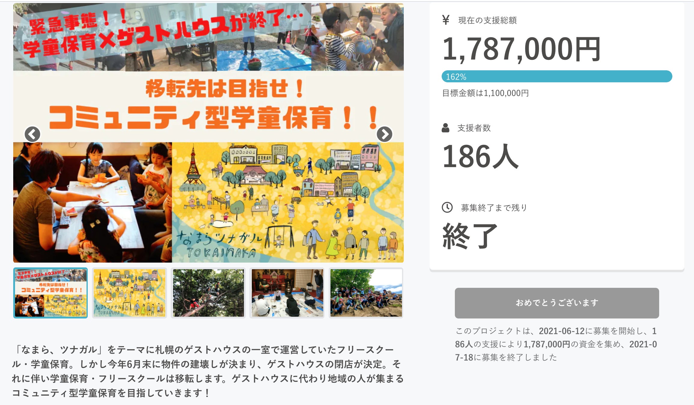 2021/07/19 12:00こんにちは!E-LINK 日向です。昨日、7月18日をもって約40日のクラウドファンディングが終了しました!!最終的に186人もの方から、1,787,000円のご支援が集まりました!本当に、言葉では言い表せないほど嬉しく、ありがたく感じています。110万もの大金、本当に集まるのかどうか、始まるまで、始まってからも不安で仕方ありませんでした。それでも、こどもたちが育つ環境の大切さ、そこで出会う大人と関わることの意義、大人がこどもたちと、また同じ地域の人とも、違う地域の人達とツナガルことの意味。なまら、ツナガル。トカイナカな社会。それをまさに体現するかのように、みなさんのご協力・ご支援のおかげで無事達成対しました。改めてご支援、ご協力頂いたみなさま、本当にありがとうございました。順次、ご支援頂いたみなさまにもメッセージ、リターンのご案内をさせて頂きますが、このご縁を大事にしたく、個別でのご対応とさせていただくため、ご連絡やリターンの発送にお時間を頂戴する場合がございます。どうかご理解の程よろしくお願い致します。尚、リターンは全て9月以降、記載されている次期を目処にご案内させて頂きます。また、既にお伝えしたように、7月1日には新天地へと移転してこどもたちも新たな場所でスタートしています。こどもたち、保護者の方々、ボランティアの仲間たちと、多くの方々の協力を得て素敵な空間になりました。早速、大学生から旅人、市外、道外から様々な立場の人が子どもたちと遊びに来てくれていたり、近隣店舗の方や地域の方にも笑顔で見守られている光景も出てきています(^^)とはいえ、【コミュニティ型学童保育】としての挑戦はこれからです。◎地域のレンタルスペース◎まちなかライブラリーなどの整備はこれから始め、9月頃から実施予定です。これからこどもたちが、大人が、地域が、ツナガル場所としての私たちE-LINKのリスタート。みんながこの場所を訪れることで、コミュニティ型学童保育の一歩となっていきます。みなさん、ぜひぜひ、新しくなった場所に、こどもたちに、私たちに会いに来てくださいね。いつでもお待ちしています!!NPO法人E-LINK代表理事 日向洋喜 もっと見る