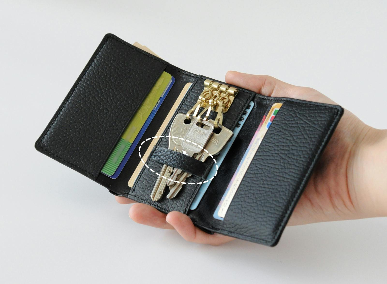 本製品は革ベルトの追加縫い付けによりデザインを損なわず、鍵が定位置に収まります。必要な鍵のみ取り出せ、またカードだけ取り出したいときも邪魔しません。