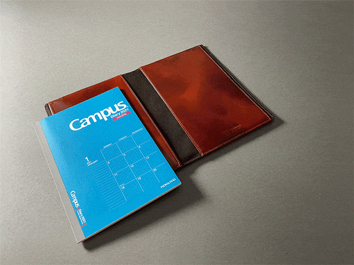 市販A5サイズ(H210 x W148mm)のノート、ダイアリー、本などが、すべて入ります。そのため、ビジネスでも、プライベートでも、自分だけの組合せの1冊ができます。
