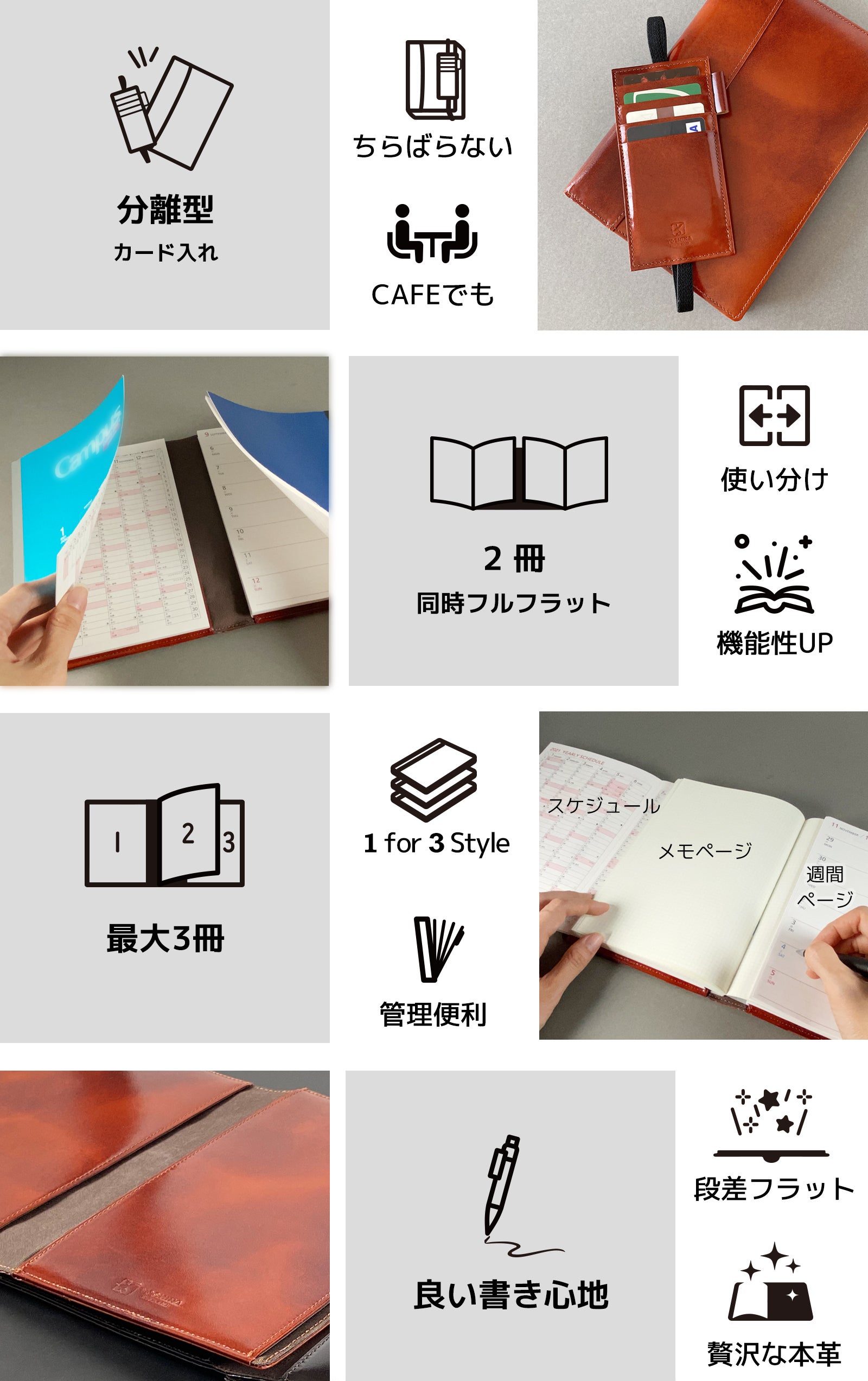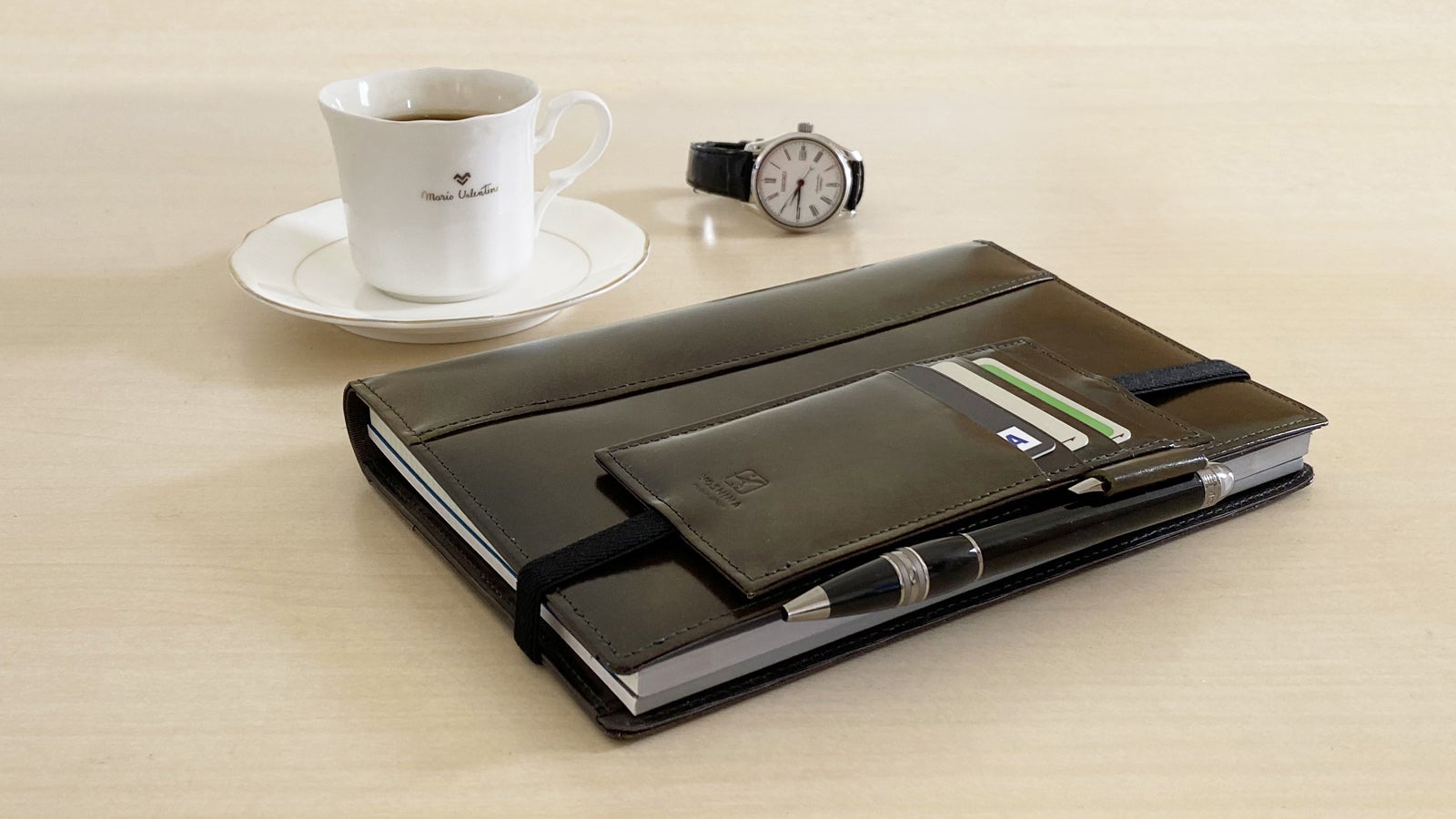 カード入れとペン差しをセパレート式へ変更し、本革を惜しみなく使用することで、最初から最後までスムーズな書き心地となるデザインを追求しました。