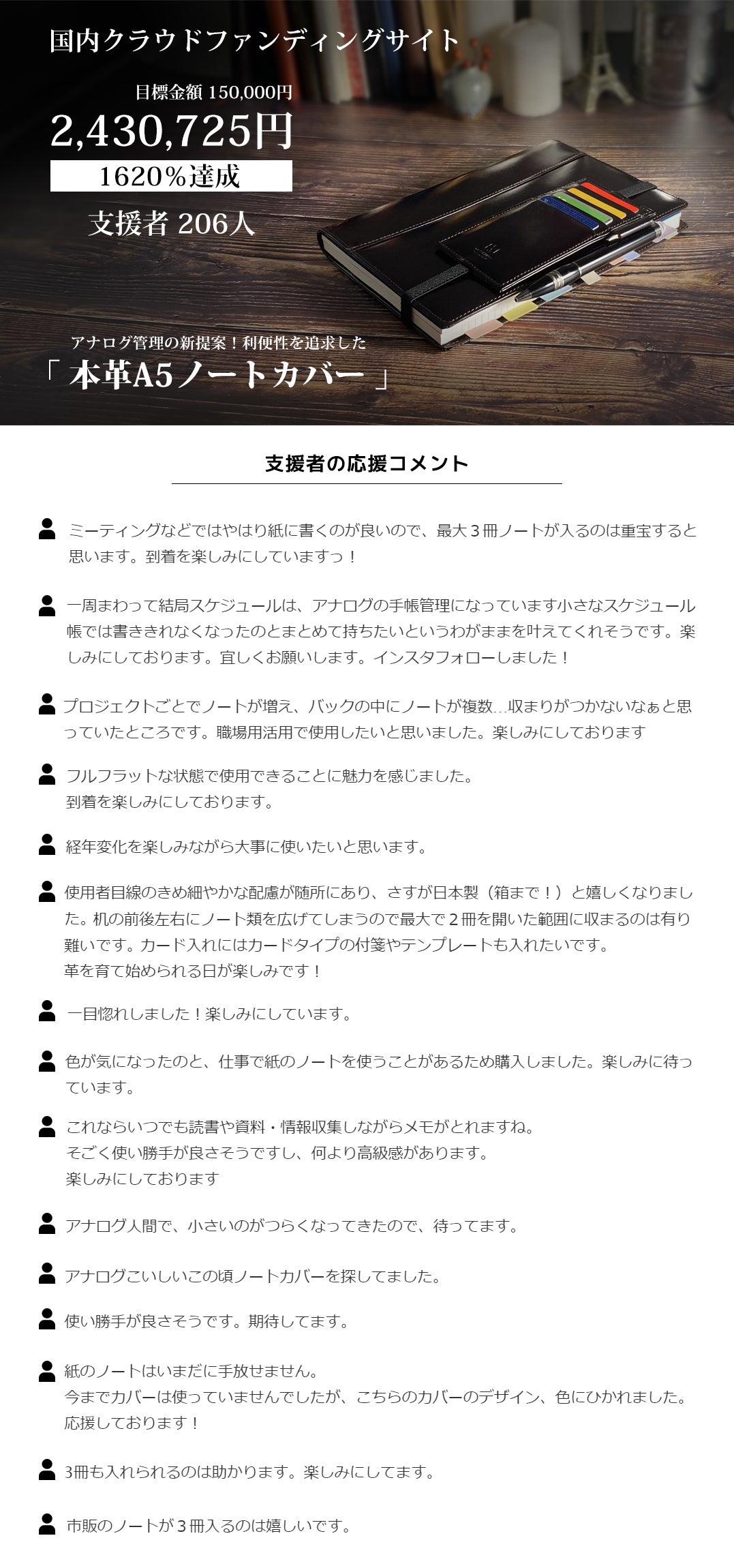 国内クラウドファンディングサイトにおいて、開始2時間程度で目標金額を達成。最終的に200名超えの方々にご支援いただき、本革ノートカバージャンルの支援額1位を達成しました。