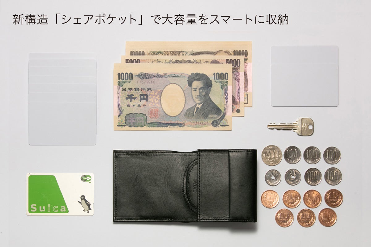 特許取得済(特許第6879604号)の新構造「シェアポケット」 という部分がミソで、入れるカードを減らせば想像以上の収納スペースがうまれるのが特徴です。