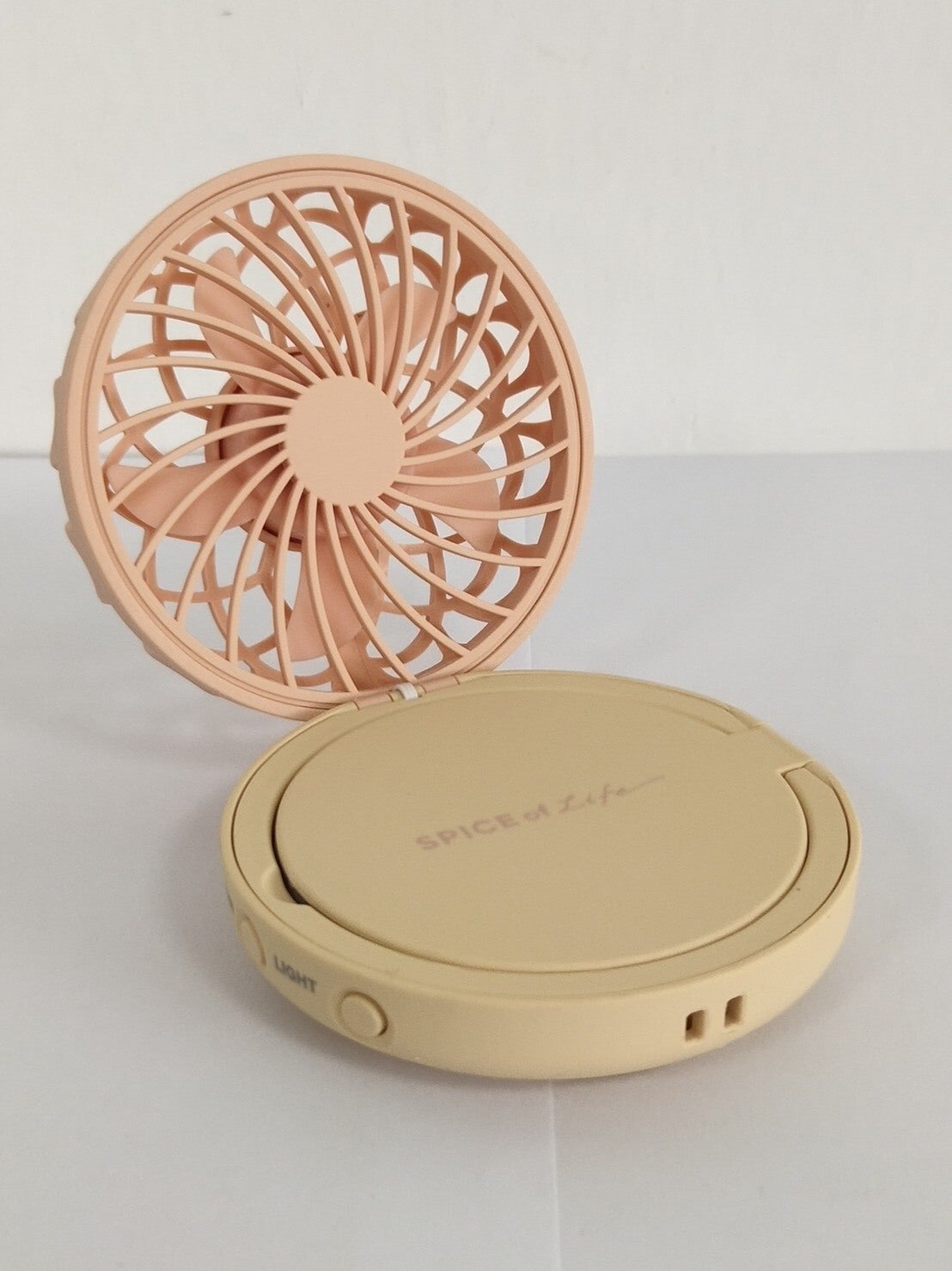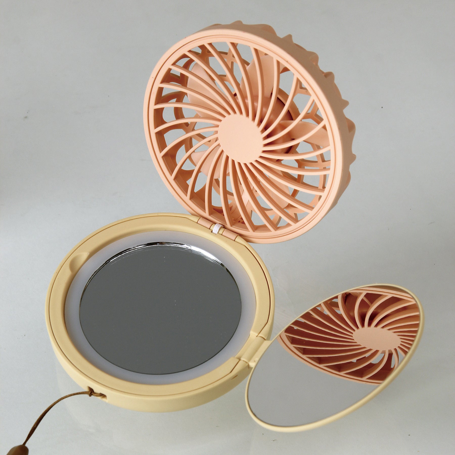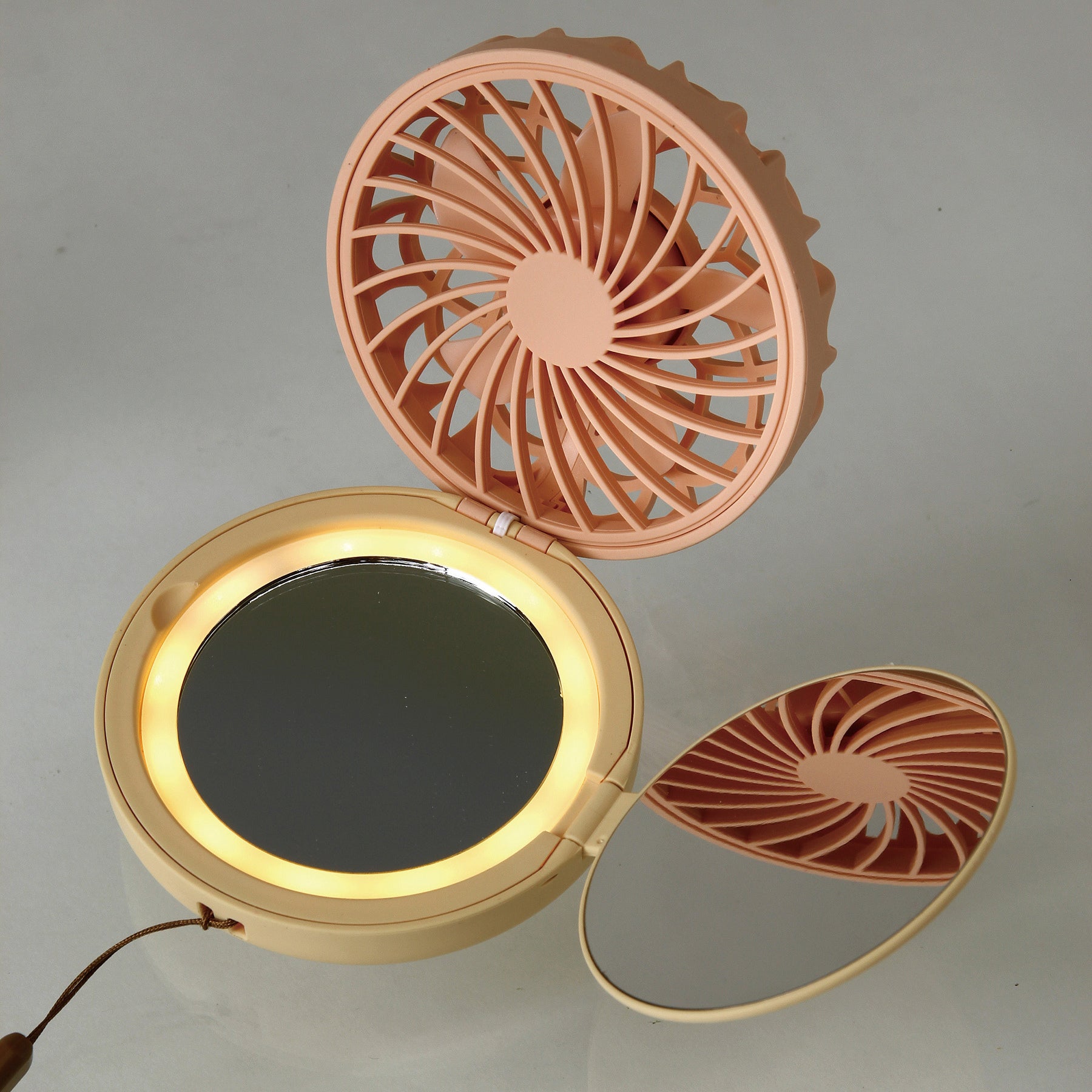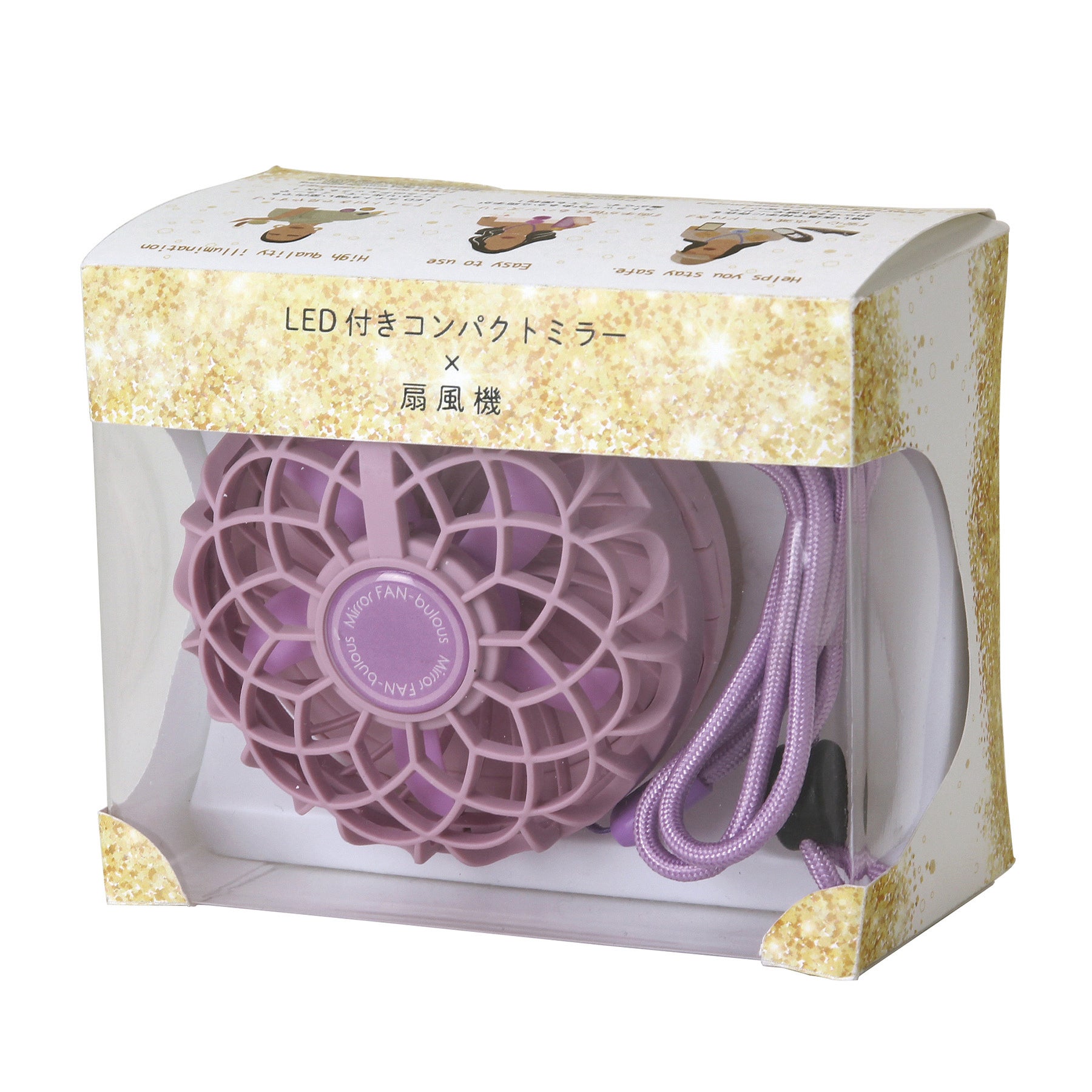 その名の通り、コンパクトミラーとポータブル扇風機を一体化したもので、鏡の周りには女優ライトとも呼ばれる、顔に影ができなくするためのLED照明がついています。扇風機の風で涼みながら、メイクが崩れていないかをチェックできるすぐれものです。