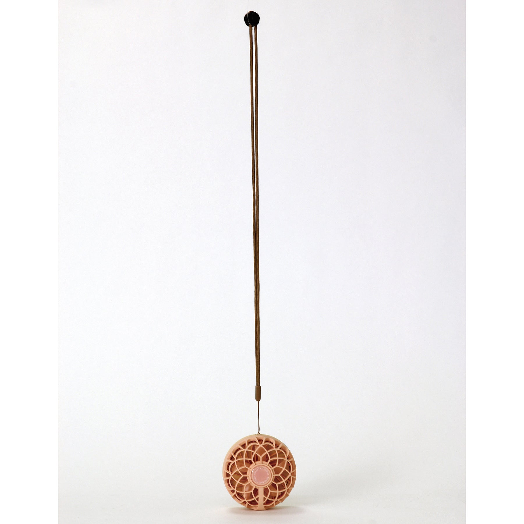 ストラップを通す穴もあり、首から下げることも可能。直角に開いて首から下げると、下から風が来る設計です。
