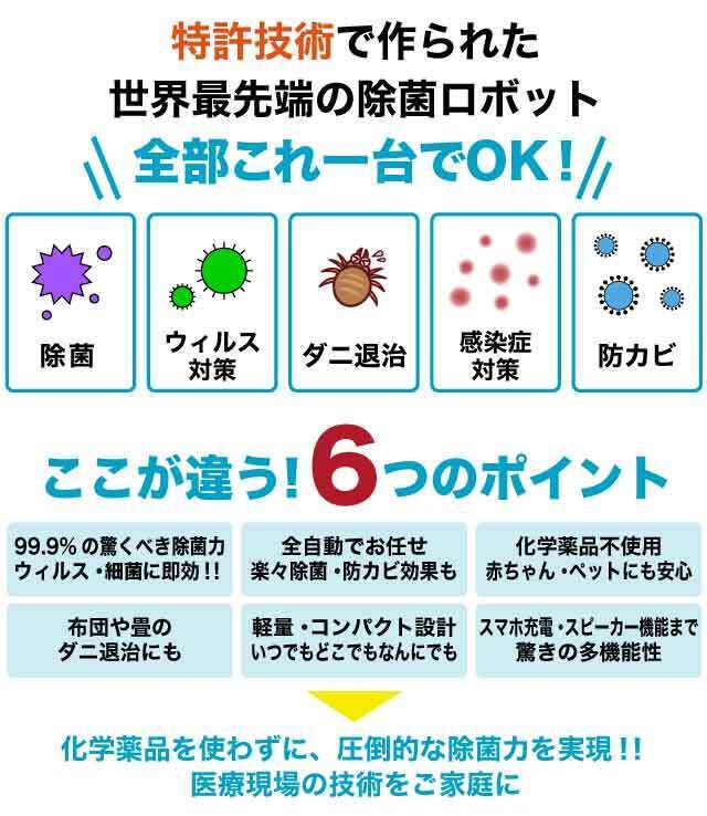 除菌、というと「大変」「面倒くさい」「不安」などとマイナスのイメージを持たれがちですが、この除菌ロボットはそのマイナスのイメージを覆す、「ボタン1つで楽々」そして「音楽を聞きながら楽しく」できる特徴があります。さらにエビデンスがきちんと出ており、除菌効果・ダニ駆除効果が認められています。