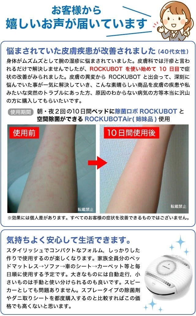 2021/07/29 09:00皆様こんにちは!温かいご支援、誠にありがとうございます。約1か月に及ぶプロジェクトも明日23:59で終了となります。ウイルス対策が気になる毎日であることはもちろんなのですが、最近、ダニについて多くのお問い合わせを頂くので簡単にまとめさせて頂きます。畳にも使えますか?という質問を頂きましたが、もちろんお使い頂けます!!(コンパクトサイズのロボなので、お部屋全体をするにはある程度お時間はかかりますが)除菌ロボROCKUBOT、ダニに対する効果検証は(株)愛研様に依頼して検証してもらっています。約3週間の検証で、ヤケヒョウヒダニについてどれだけ効果があるのか調べました。【検査方法】それぞれ200匹のダニに対して①一つはなにもしない②もう一つは毎日除菌ロボを使用除菌ロボを未使用の媒体①は、なんと3週間で600匹までダニが増えました(恐ろしい・・・)一方毎日使用した②の媒体は、200匹のダニが14匹まで減少したという結果が出ました。つまりダニの増殖抑制効果は97.6%。何もしなければ3週間で3倍に増えるという驚異のダニの増え方にも驚きました。ダニの主食は、髪の毛やフケ、アカ、食べカスなど、このようなエサが豊富にあるご家庭では増殖スピードはもっとすごいものになるかと予想されます。布団を干すのは大変な作業ですよね・・・またベッドのマットレスのケアもまた悩むところだと思います。除菌ロボROCKUBOTのUVCは太陽光の1600倍の力があります。お布団を干すより、断然ダニ対策の効果があります。そして何より、ボタン一つで全自動で動いてくれるので楽々布団ケアができるのです。40分で自動停止機能もついておりますので、お出かけ前にピッとボタンを押していけば、除菌されたお布団で寝ることができます。(目安はシングルサイズで約20分)天気も時間も気にせずに、ダニ対策はぜひROCKUBOTにお任せください!一つ注意点は、1回(短期間)の使用ではあまり効果がわからないと思いますので、継続的にご使用くださいませ。毎日でなくても大丈夫ですので、定期的な使用をおすすめします。また吸引機能はついておりませんので、ダニの死骸が気になる方はコロコロや掃除機などをご利用ください。ダニアレルギーなどがない方、ダニを死滅させるだけでも十分お布団ケアとしては意味があることだと思います。化学薬品を使わないダニ対策、ぜひ試して頂きたいと思います。長くなり申し訳ございません。最後までどうぞ温かいご支援、よろしくお願い致します。株式会社EGLOKINAWA 物販プロジェクトチームマネージャー もっと見る