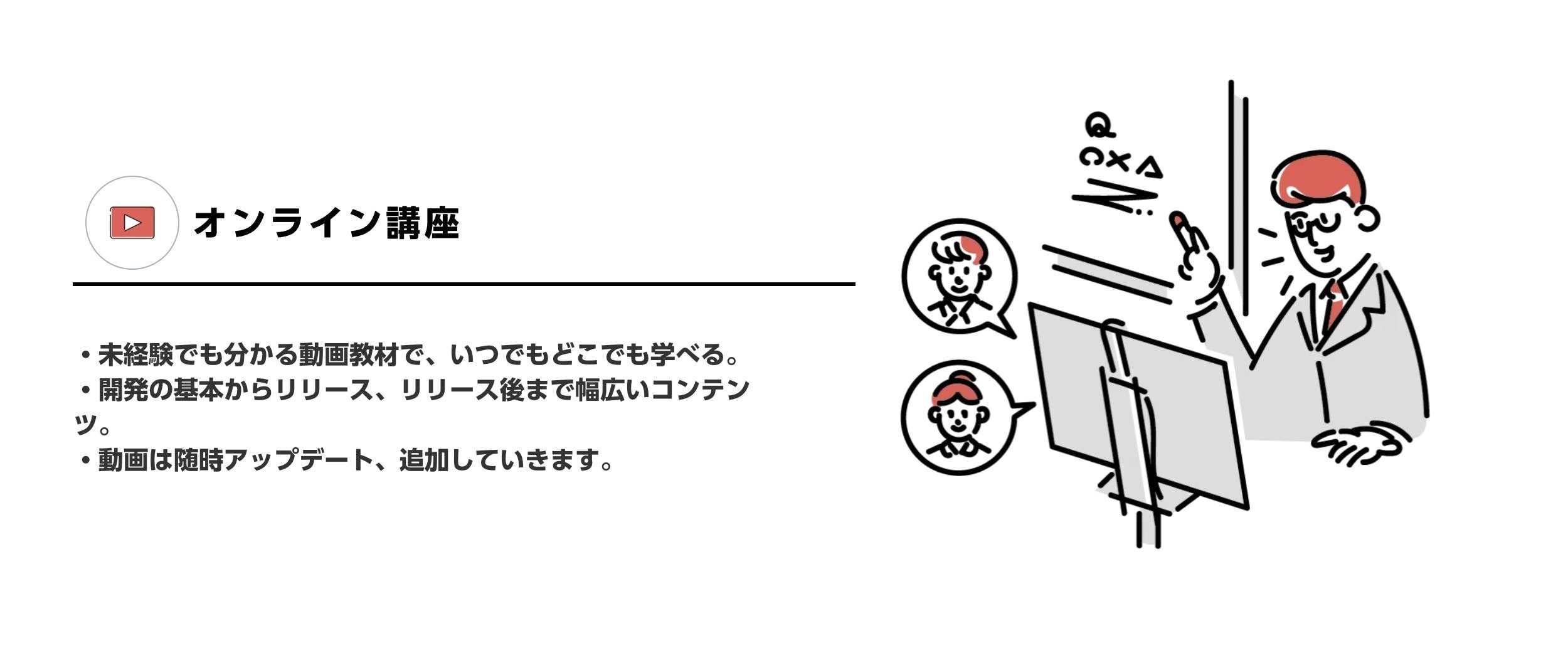 A:それぞれの開発に合わせて、各々で学習を進めていただく自習形式です。基本的には動画教材に沿って学習、開発を進めていただき、わからないことがあれば随時チャットで質問していただければと思います。