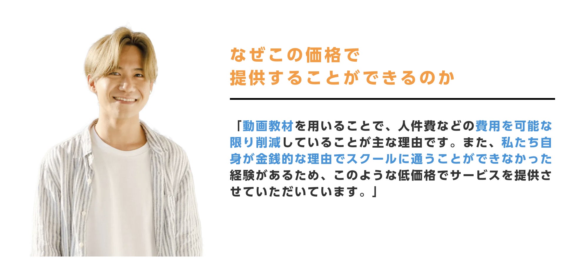 A:動画教材を用いることで、人件費などの費用を可能な限り削減していることが主な理由です。また、想定しているお客様に学生が含まれていることと、私たち自身が金銭的な理由でスクールに通うことができなかった経験があるため、このような低価格でサービスを提供させていただいています。