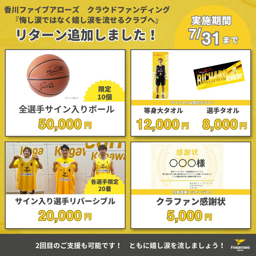 2024/07/10 18:00香川ファイブアローズ選手強化プロジェクト『悔し涙ではなく嬉し涙を流せるクラブへ』5種類のリターンを追加しました!①全選手サイン入りボール24ー25シーズンの全選手サイン入りのボールです。実際に練習で使用したボールを限定10個でご用意しました!②サイン入り選手リバーシブル選手が練習時に着用しているものと同じデザインのリバーシブルをサイン入りでお届けします。③サイン入り等身大タオルクラウドファンディングだけの限定商品です。実際の選手と同じ大きさの特大サイズかつサイン入りでご用意します。今回限りの商品です。④サイン入り選手タオルこちらもクラウドファンディング限定デザインのタオルをサイン入りでご用意します。今シーズン初の選手タオルです!⑤クラファン感謝状生岡直人代表取締役から感謝を込めた直筆メッセージ入りの感謝状をお届けします。今回ご支援いただいた記念にいかがでしょうか?世界に一つしかない感謝状です!どれもクラウドファンディング限定の商品です!優勝するチームを作るためにも今一度力を貸してください。2回目のご支援も可能です。よろしくお願いします!ご支援はコチラから!https://camp-fire.jp/projects/view/765832?utm_campaign=cp_po_share_c_msg_mypage_projects_show もっと見る