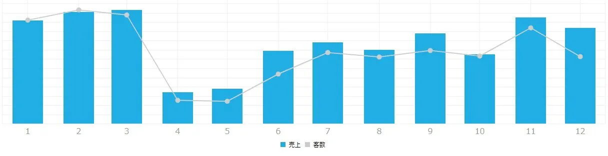 具体的な数字は伏せますが、2020年の売上グラフです。棒グラフが売上金額、折れ線グラフが来店人数となります。