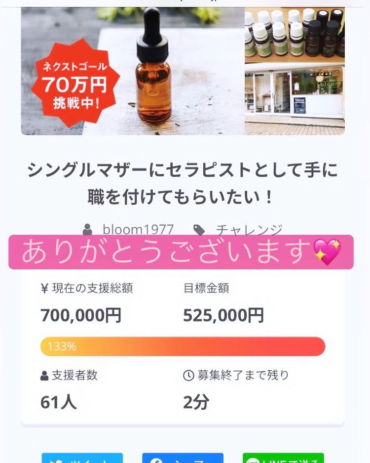 2021/07/31 23:39こんばんは。ご報告です。お陰様で、昨夜 終了時刻2分前にネクストゴールの70万円を達成することができました。61名のご支援いただきました方々本当にありがとうございました!ご支援を下さった方のお名前を拝見してびっくりしたり、連日 あたたかいメッセージに本当に何度も励ましてもらいました。心より感謝申し上げます。ハプニングとミラクルがいくつもありました!学びと感動もいただきました!!本当にありがとうございました!bloom 白幡百合子...#お礼 #クラウドファンディング #チャレンジ #キャンプファイヤー #bloom #静岡県島田市 もっと見る