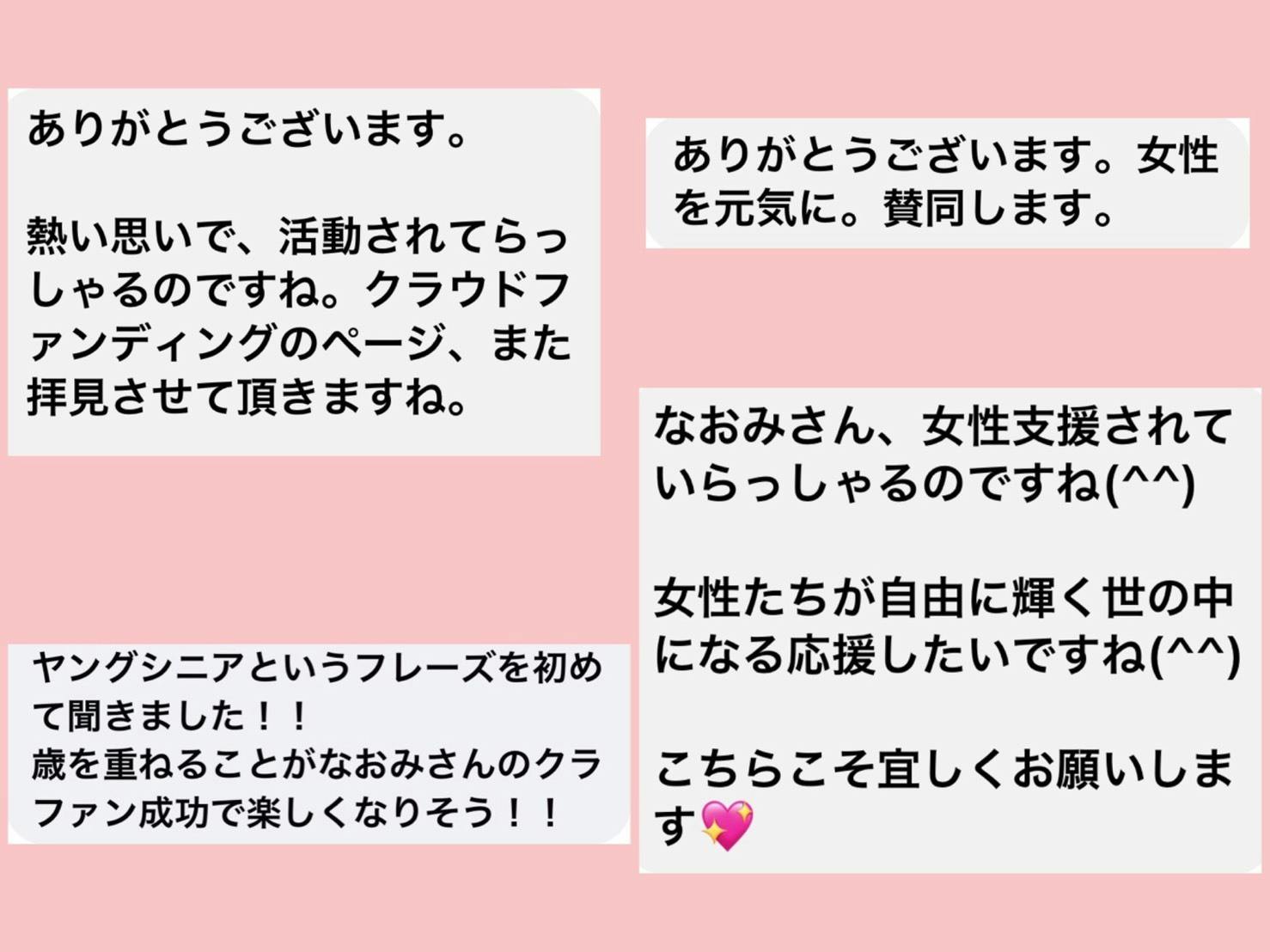私のFacebookの投稿や、メッセンジャーに、「女性を元気に!」という思いに賛同する方々から応援のメッセージをいただいています。ありがとうございます(#^.^#)
