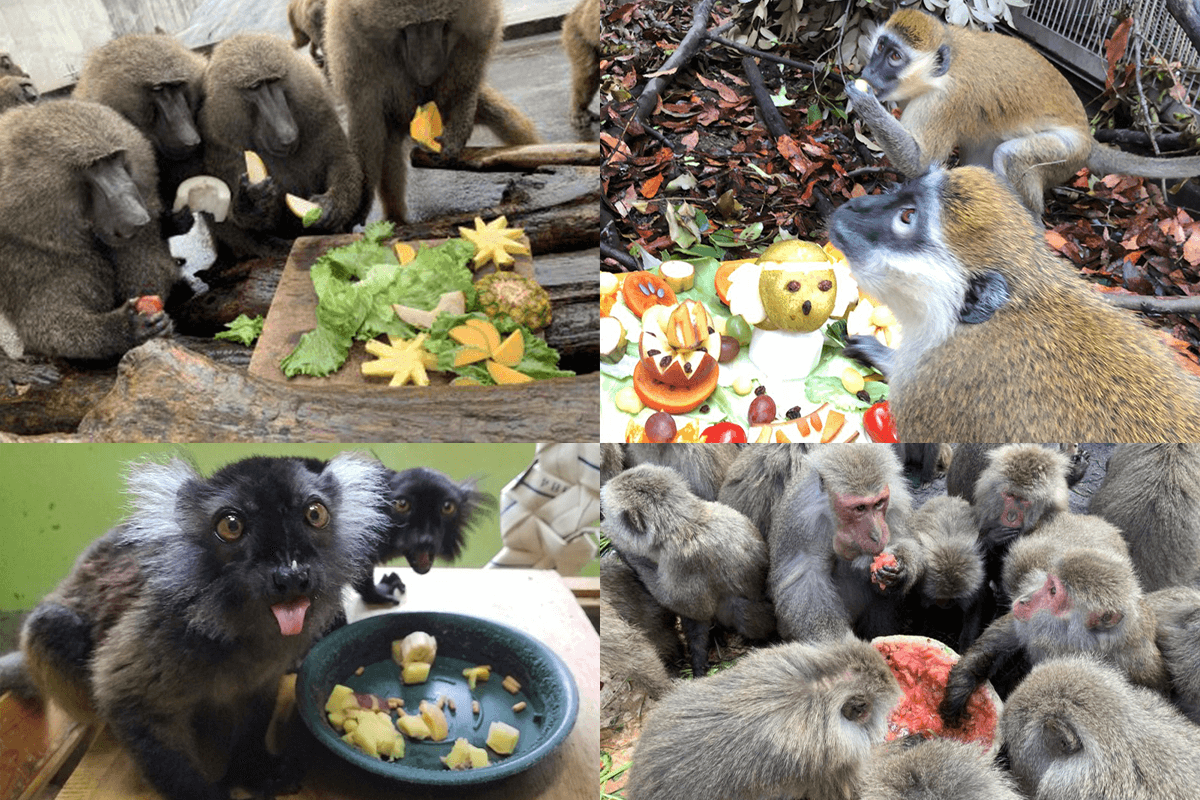 日本モンキーセンターには、霊長類約60種、約800個体がくらしています。限られた予算の中で、少しでもたくさんの種類の野菜や果物を確保したい、そんな想いで、飼料班のスタッフが中心となって、いろいろな方法で飼料のご寄附をよびかけてきました。