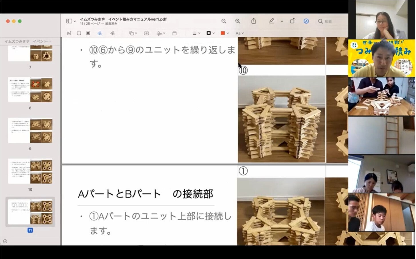 約10日前に、参加してくださる親子を対象にオンラインにて、積み方のレクチャーを行いました。つみきの特徴や、どのように組み立てていくかをお伝えしたあとに、少しだけ一緒に積んでいきました。そのあとには、<宿題>として自主練するようお願いをして、1時間のレクチャーは終了しました。それから約1週間後、親御さんにお願いしていた「子どもたちがつみきを積む様子を動画で撮影する」の宿題がぞくぞくと届きました。両手で1本ずつ積み上げる子もいれば、パパっと置いていく子もいて、一人ひとりスピードも慎重さもバラバラです。個性が出ているなーと感心しながらも、各家庭ごとに「もっとこうしてください」とお願いして今はスピードアップを図ってもらっています。(正直いまのペースでは初日に2mくらいしか積みあがらないかもしれないんです...)もちろん僕たちもフォローはします。しかし、初日は挑戦する子どもたちが主役なので、最大限自分のちからを出し切れるよう、コツコツ、コツコツ練習を重ねてもらうしかないんです。少しでもみんなで高さを出していくために、頑張ってもらうのみ!僕は、というと、世界記録認定に必要な測量士や立会人を探したり、足場の業者さんや施設の担当者、世界記録の認定員と打ち合わせたり、と先週もバタバタでした。あとは、本番の生配信のことや、世界記録のための準備...子どもたちの個性を見極めながら、どの時間帯でどの部分を積んでもらうのが最適か座組も考えないといけません。やる事はいっぱいだけど、泣いても笑ってもあとちょっとで本番なので。できることをコツコツと進めていこうと思います。最後まで応援、どうぞよろしくお願いいたします!
