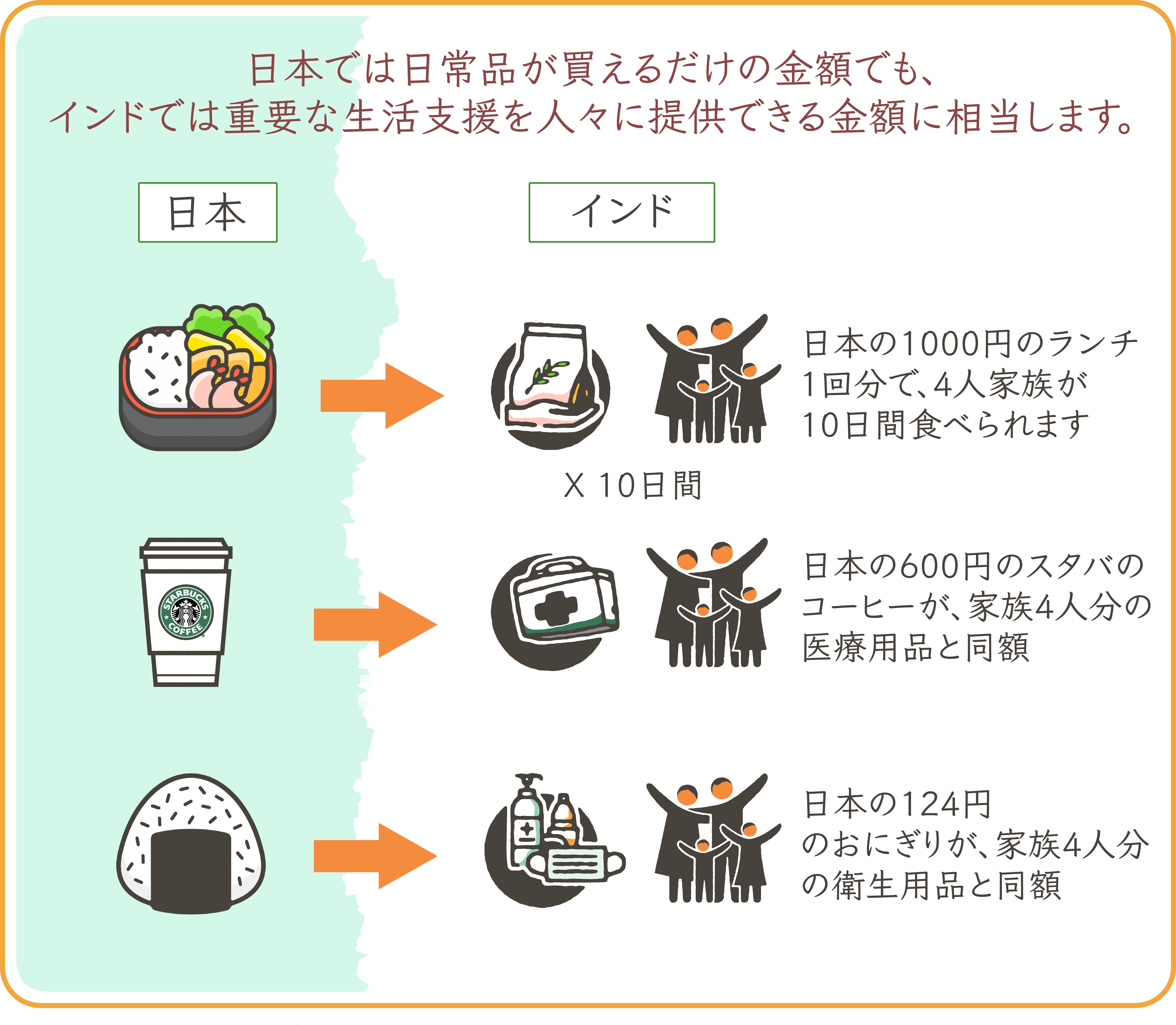 東京より物価の安いインドでは、皆さまの小さな助けが大変大きな支援となります。ほんの少しでも、力を貸していただけませんか。