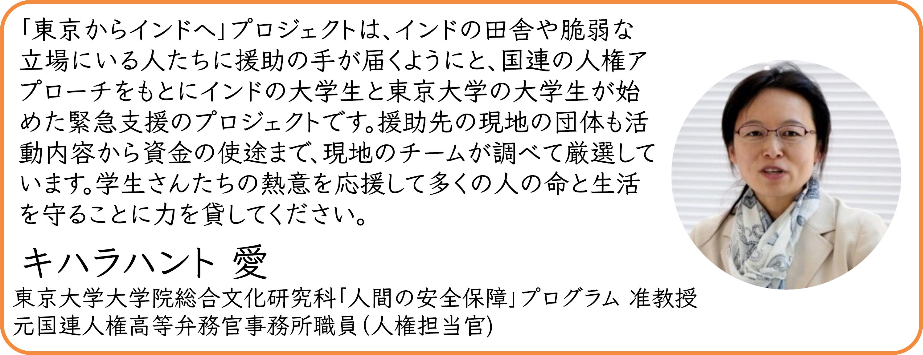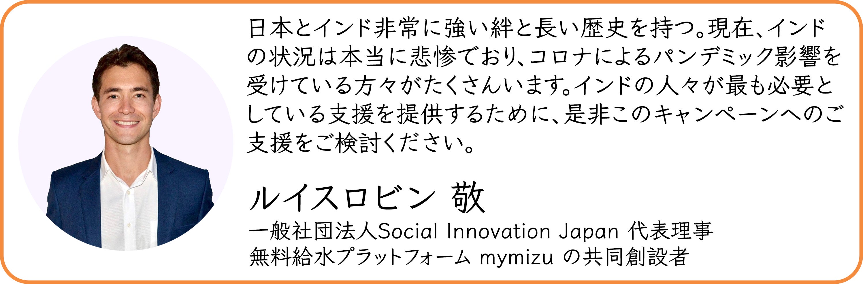 昨年我々が得た教訓があるとすれば、パンデミックがどこかで起っていれば、それは至るところで起こっているということです。インドのような国ー世界で2番目の人口を持つ国ーでは、特にその様子が顕著に現れるため、支援が今この瞬間にでも不可欠です。先日日本政府がインドへの援助を表明したように、政府による支援物資は重要ですが、支援の手は大都市や、物資を受け取れるネットワークを持つコミュニティには届いても、社会的に脆弱な立場にある人々や、支援体制が整わない田舎などにはなかなか届きません。同じコロナ禍の医療危機、人道危機でも、貧困や社会的疎外などでもともと脆弱な立場にある人達には、即ち命の危機となるのです。私たちのような市民団体は、社会的弱者や他の市民団体へ、迅速で直接的な支援が可能です。