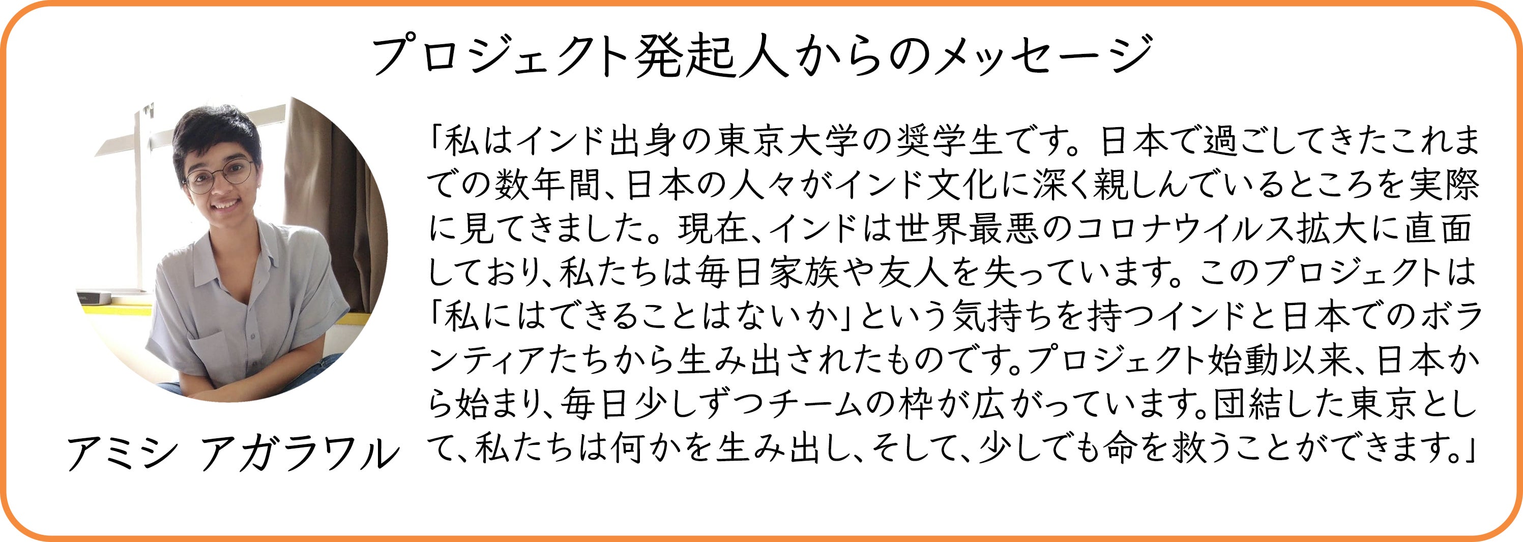 「Tokyo for India」という名前は、我々日本チームの大多数のメンバーが東京に住んでいるためつけた名前であり、このプロジェクトは日本全体が一丸となってインドを支援することを目的としています。日本のどの地域からでも、「Tokyo for India」プロジェクトに参加できます。