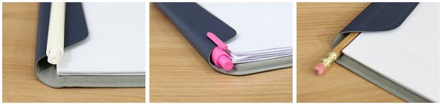ボールペンのホルダーを利用して軽く差し込んでください。外側でも内側でも度の方向でも構いません。A4-PADの固定部を開いて鉛筆やボールペンを収納してもOKです。
