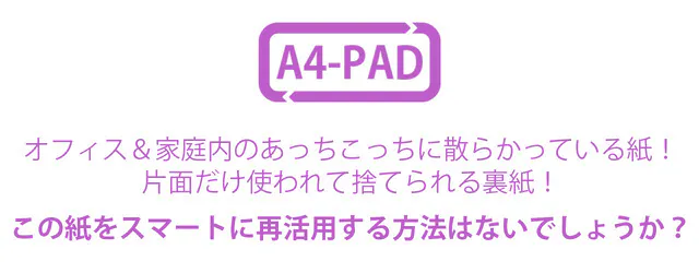 A4-PADは裏紙発生率が高いA4サイズの用紙からの“A4”と丈夫で安定に支えてくれる“PAD”の合成語として誕生しました。