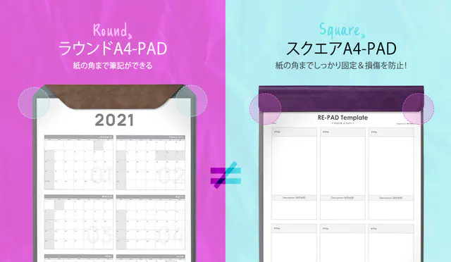 今回、ご紹介するA4-PADスクエアはその名の通り、紙の角の部分までしっかり固定&保護ができるようにデザイン設計しました!