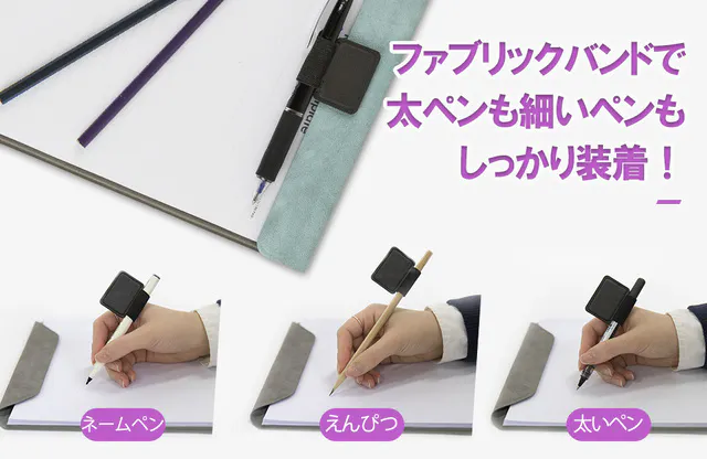 丈夫で優れた弾力のファブリックバンドはスリムな鉛筆とボールペンに装着しての使用はもちろん、太いペンやネームペンまで問題なく安定的に装着できます。