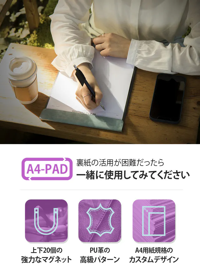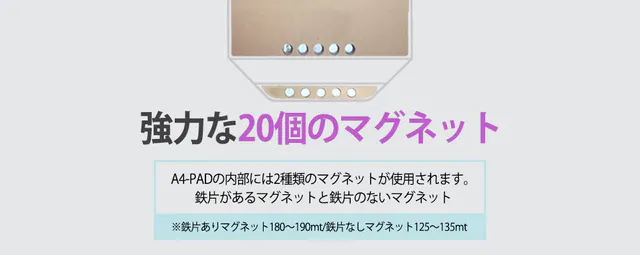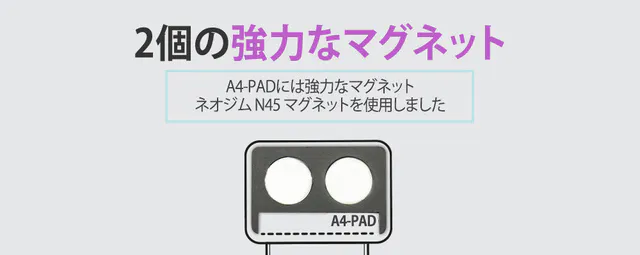 また、A4-PAD上下には強力なマグネットが内蔵され、紙をしっかり固定し、必要な場合紙の着脱も簡単にできるように設計されています。