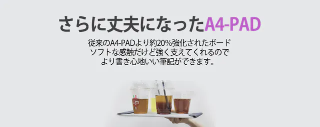 何杯の飲み物を載せても曲がることない丈夫な材質のハード用紙使用で高い耐久性を誇ります。薄いけど丈夫なA4-PADはどこでも自由な筆記とドローイングをお約束します。A4-PADスクエアは既存のA4-PADと比較して約20%丈夫さをアップしました!