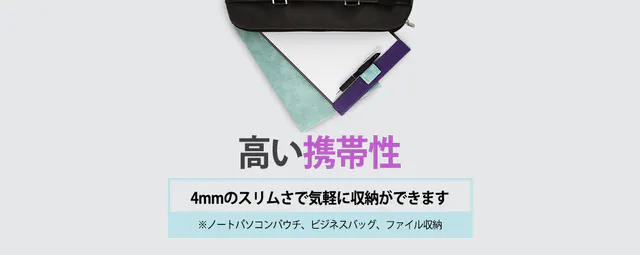 4mmの太さとA4規格のサイズで薄型ノートパソコンパウチや、書類バッグファイル保管庫などに収納が可能です。柔らかい質感だけど丈夫に支えてくれるパッドでいつ・どこでも自由に安定的な筆記が可能です。