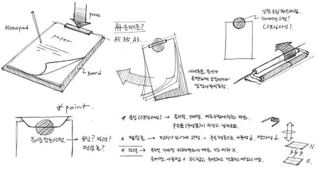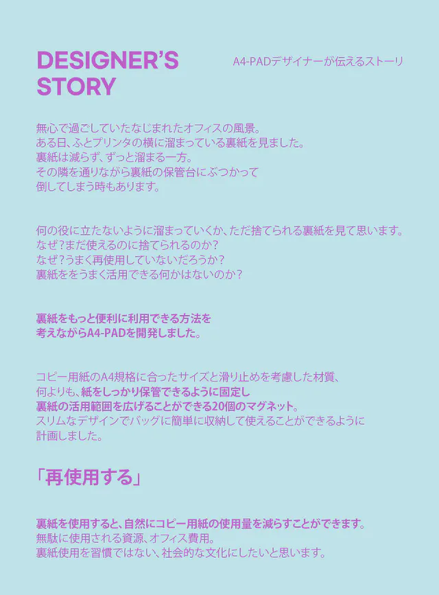 裏紙を便利で積極的に使用できる目的以外にも、A4-PADを毎日手に持って使用する際の必要な要素まで考慮し開発しました。