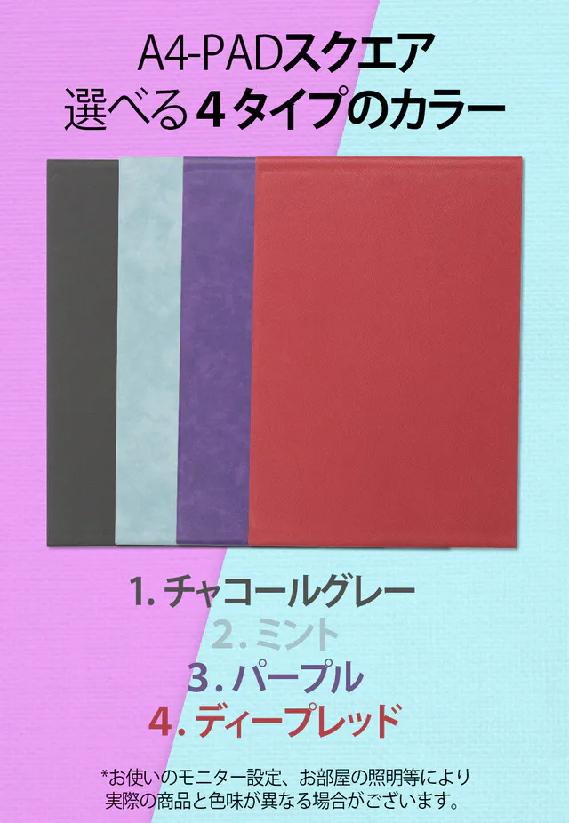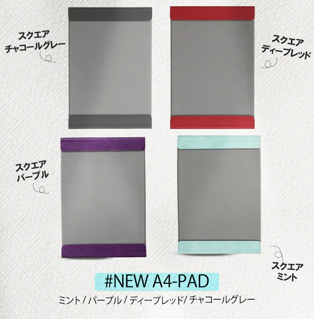 ベーシックな4つのカラーのA4-PADからNEW A4-PAD スクエアはよりおしゃれな4つの色として登場します!