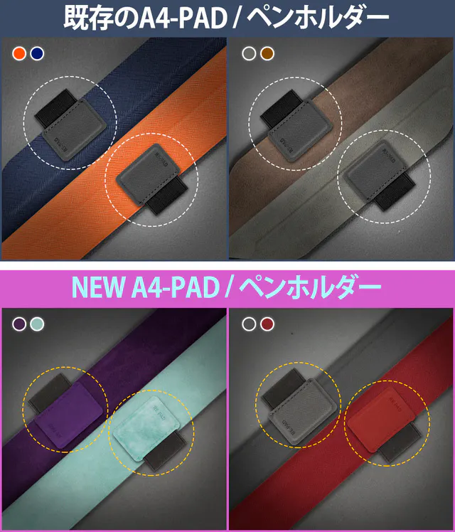 既存のA4-PADは4つのカラーバリエーションでしたが、ペンホルダーはチャコール色のみでした。この部分がすごく残念でA4-PADとのセット感がないとの意見もいただきました。