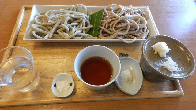 超有名店 3㎜角の太い水萌え蕎麦は日本初の製法で製粉しないで、蕎麦の実を冷水に浸し潰してそばにします。水萌え蕎麦と手碾き蕎麦のセットでお蕎麦のおいしさを楽しんでください。