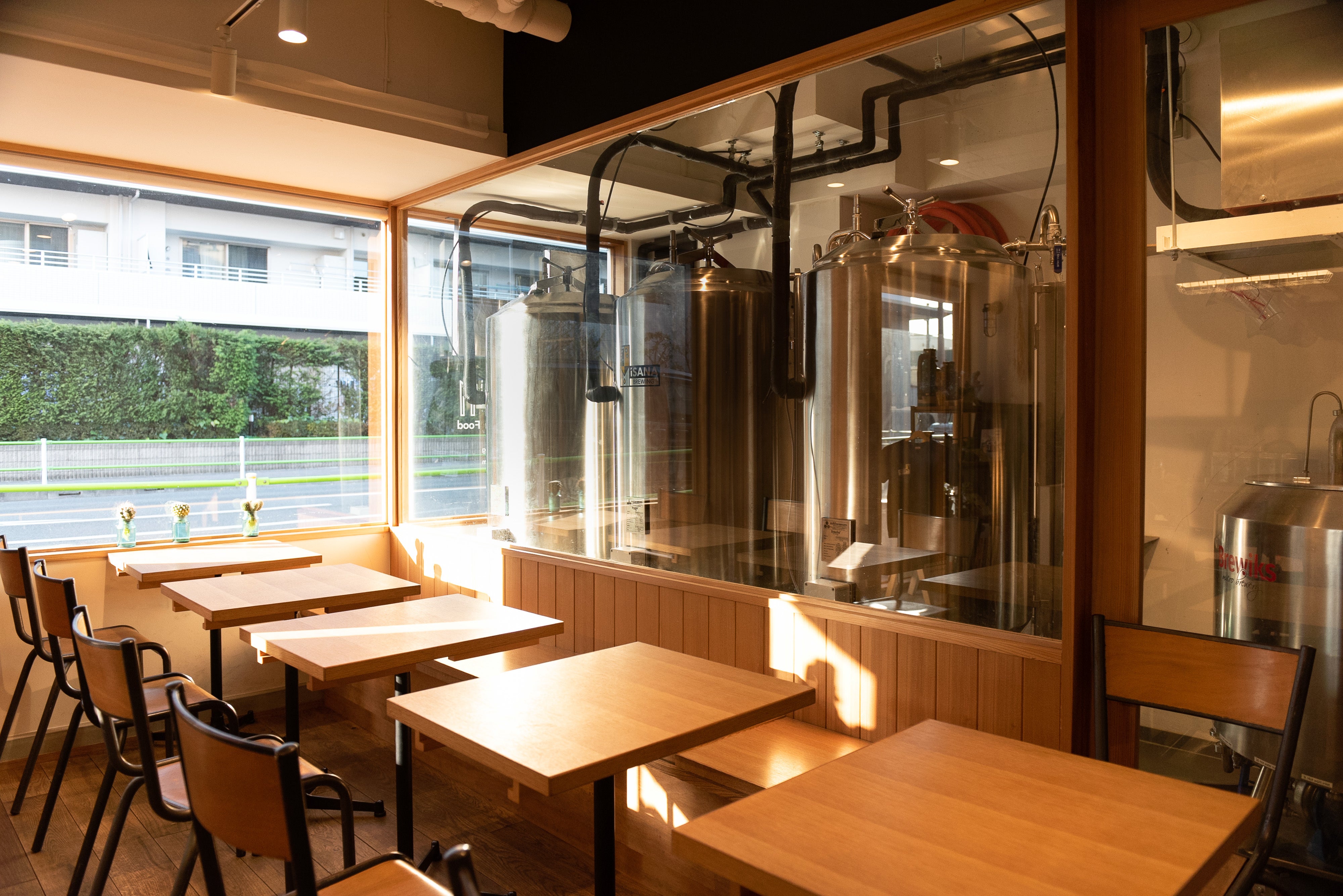 客席とブルワリーの仕切りは設計士さんに無理を言って設置した一枚ガラスを!