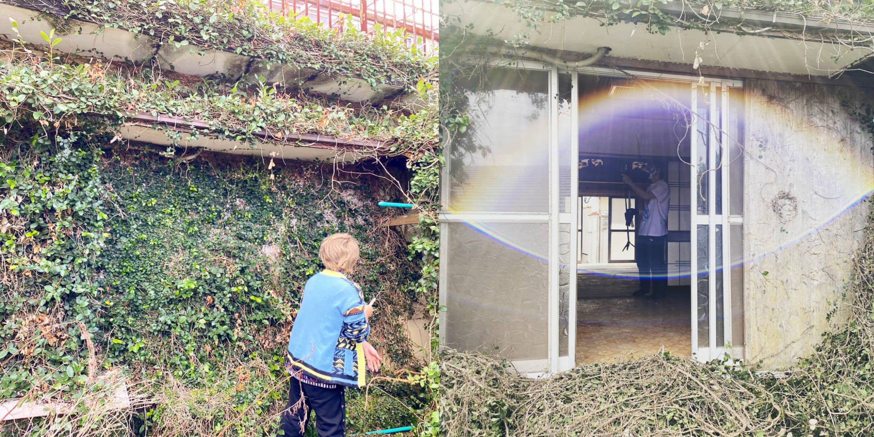 1978年に建てられた、築43年の空き家。20年間人が住んでおらず、元気いっぱいの蔦が外壁から家の中にまで伸び放題。内見した時には雨戸も開かず、中は真っ暗。天井が雨漏りでぼろぼろに崩れ、床は土埃と見たことのない虫の死骸だらけ。不動産の方と売主様にご尽力いただき、電柱から電線を引っぱり、ガスを通し、水道管を地面に通すところからライフラインを整えました。